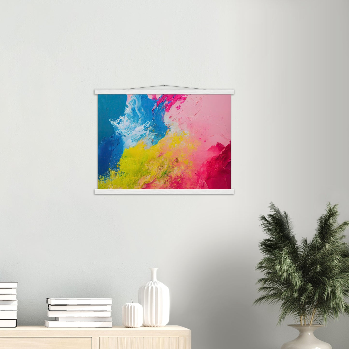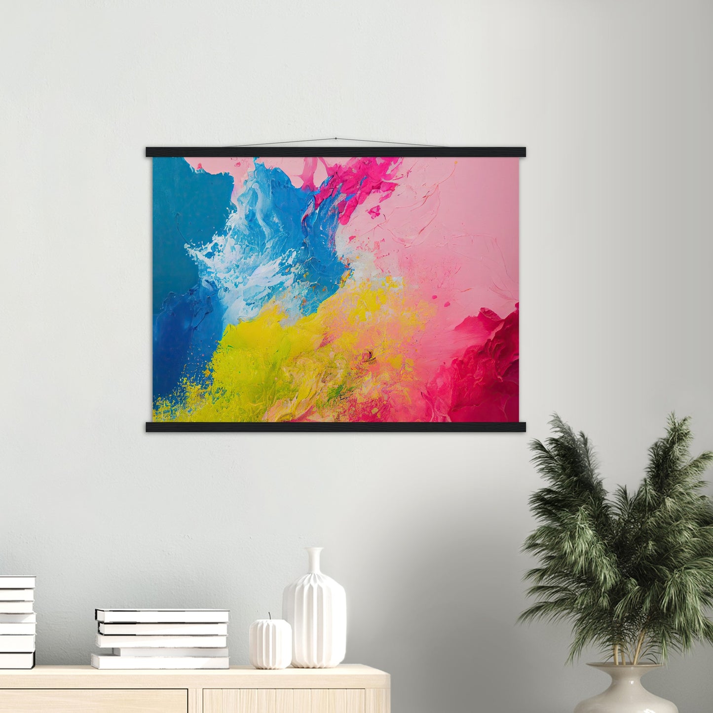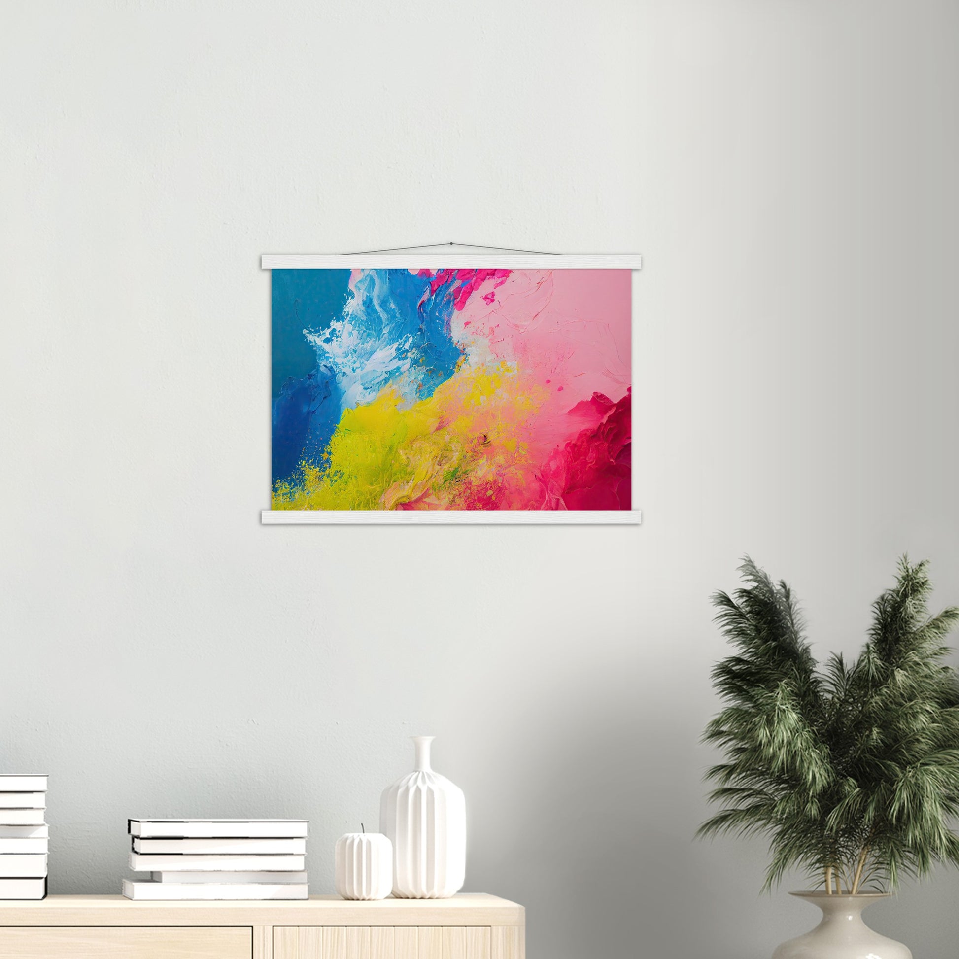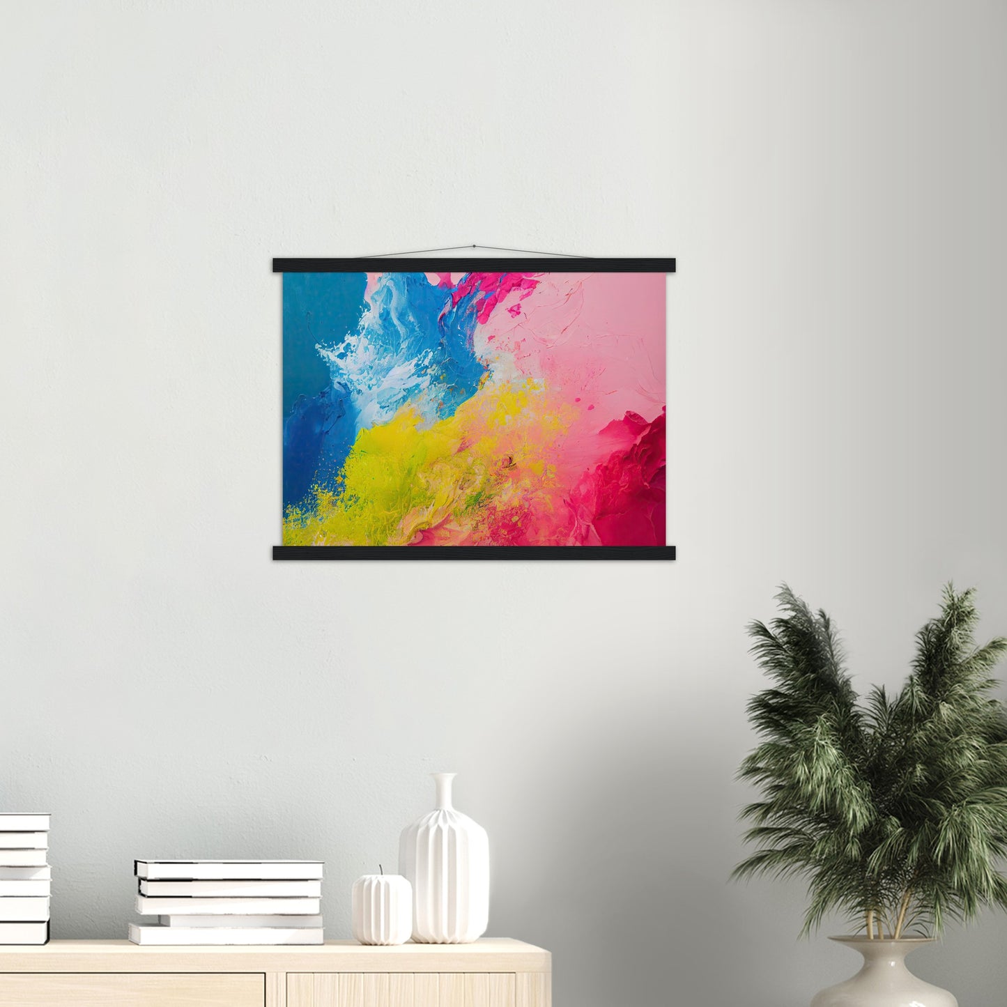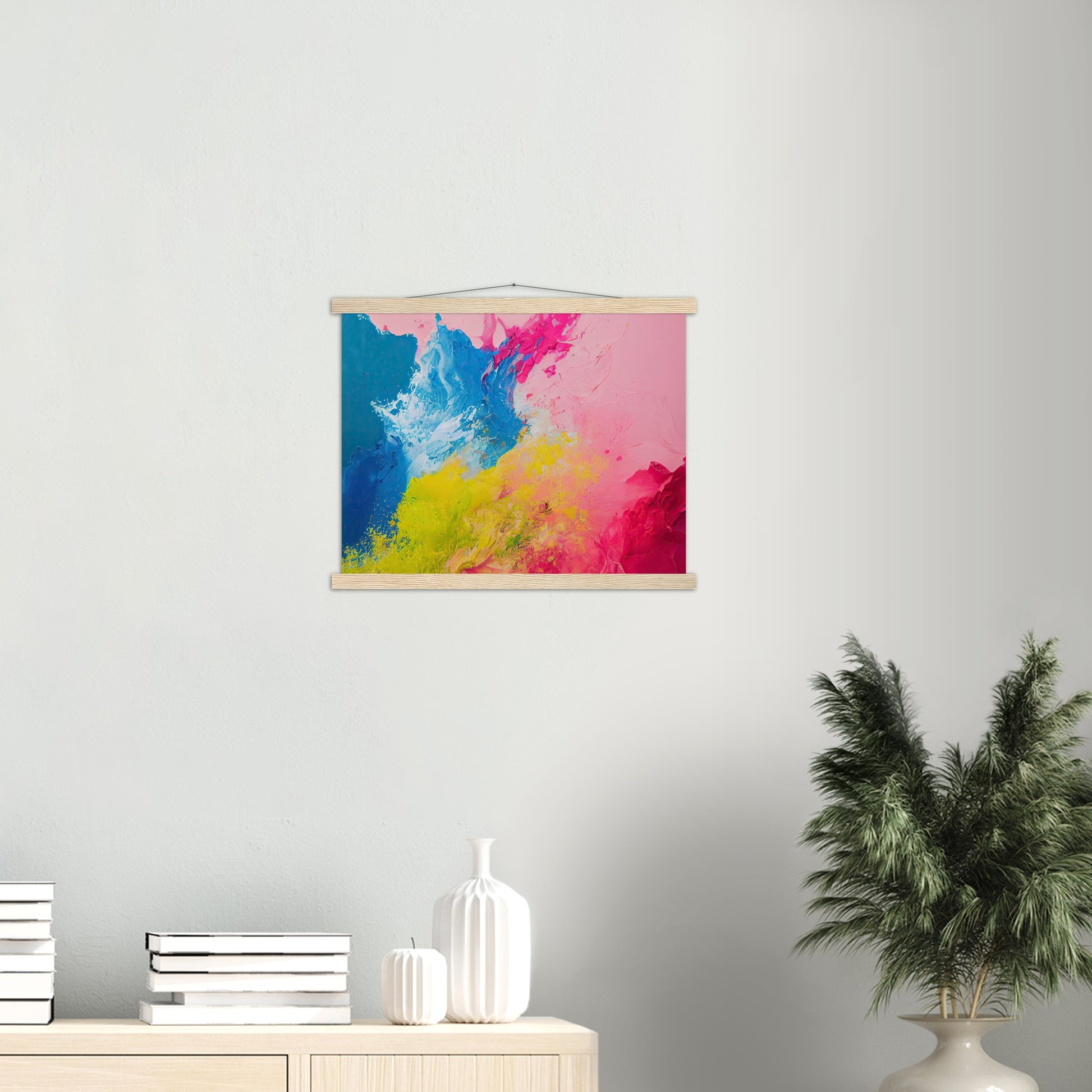Ein hochwertiges Poster und ein wunderschöner Leistenaufhänger. Jede Aufhänger enthält vier Holzleisten, zwei, die die Oberseite des Drucks festklemmen, und zwei, die die Unterseite festklemmen, sowie eine hochwertige Baumwollschnur, die zur Farbe der Leisten passt. Starke Magnete halten dein Kunstwerk sicher fest und ermöglichen es dem Kunden, das Kunstwerk bei Bedarf zu wechseln.