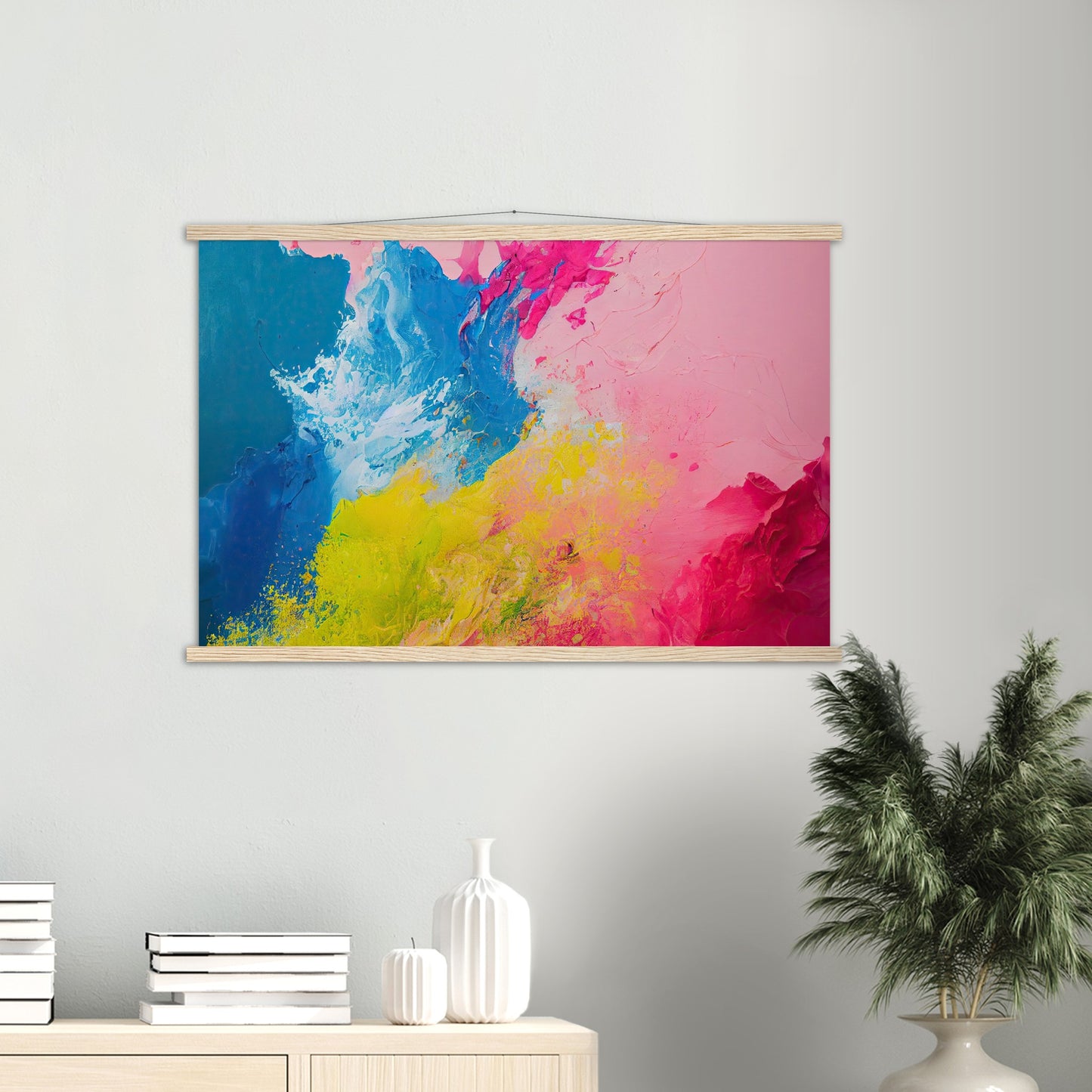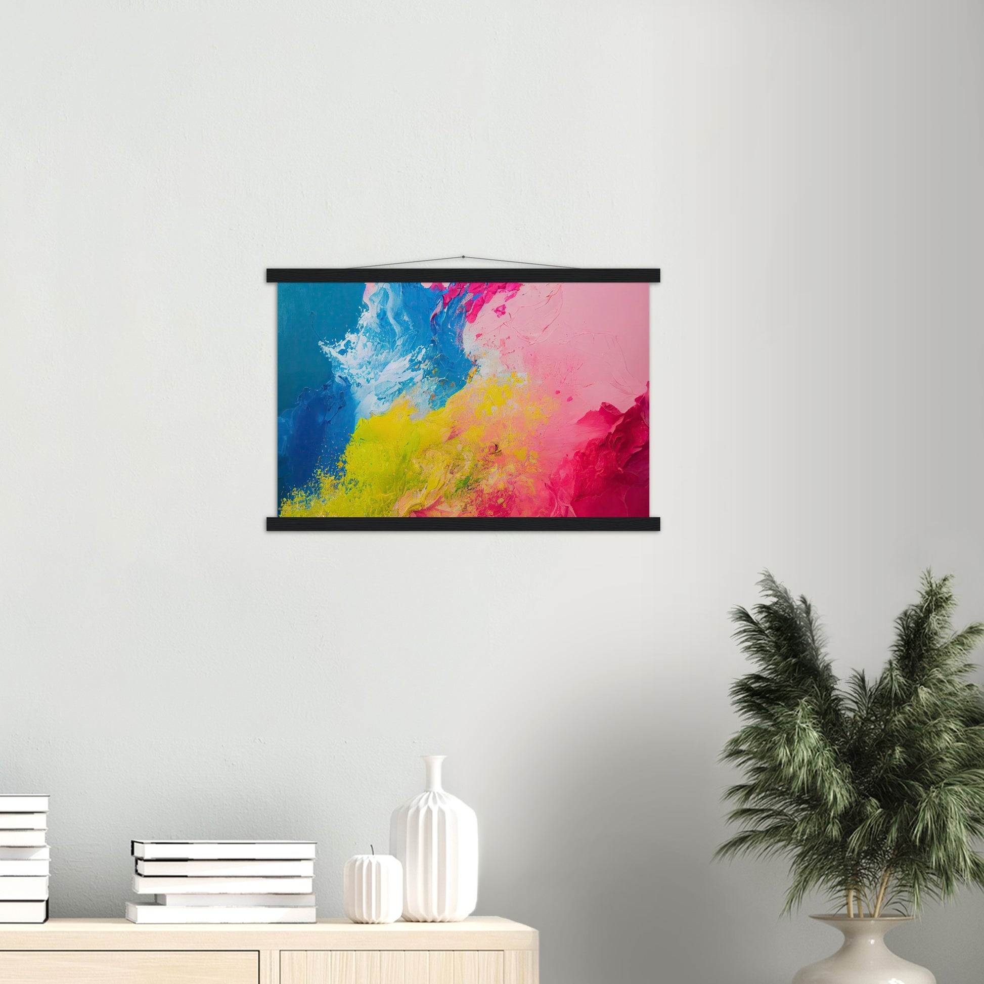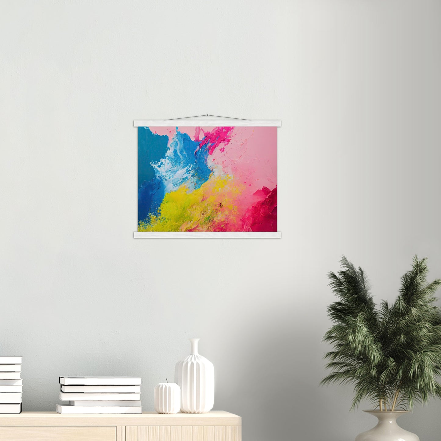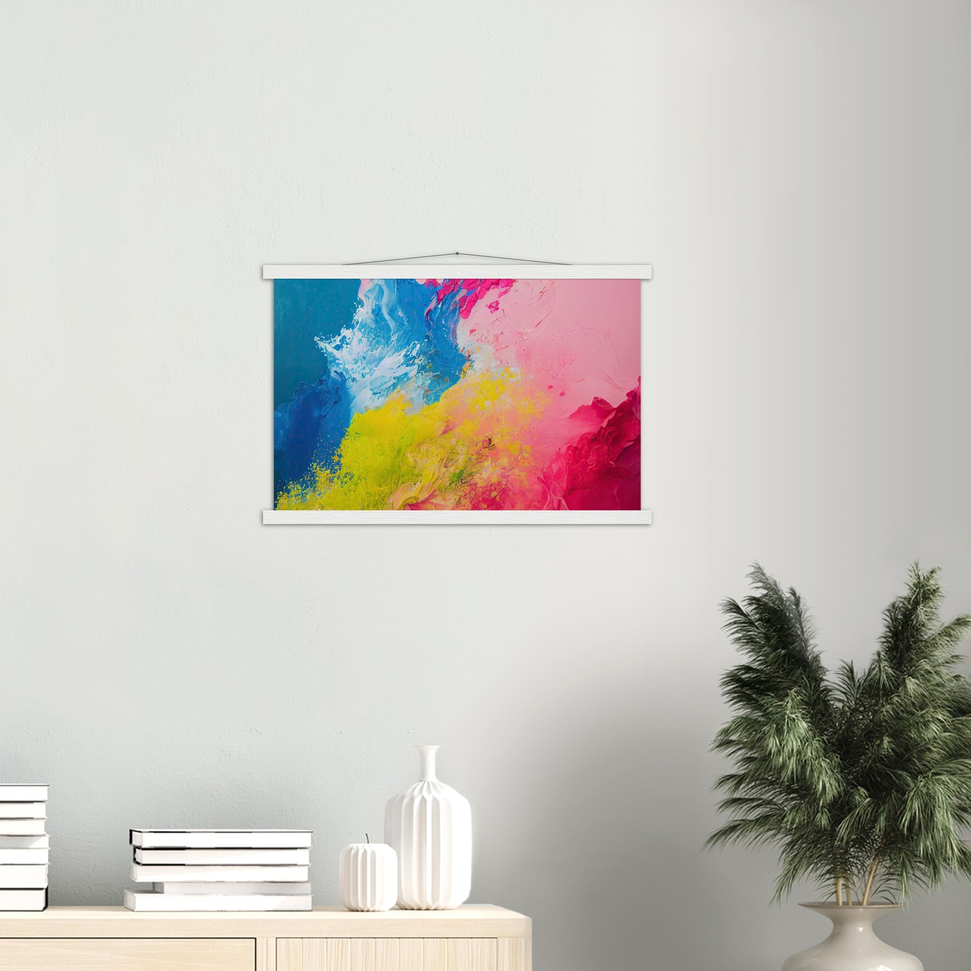 Ein hochwertiges Poster und ein wunderschöner Leistenaufhänger. Jede Aufhänger enthält vier Holzleisten, zwei, die die Oberseite des Drucks festklemmen, und zwei, die die Unterseite festklemmen, sowie eine hochwertige Baumwollschnur, die zur Farbe der Leisten passt. Starke Magnete halten dein Kunstwerk sicher fest und ermöglichen es dem Kunden, das Kunstwerk bei Bedarf zu wechseln.