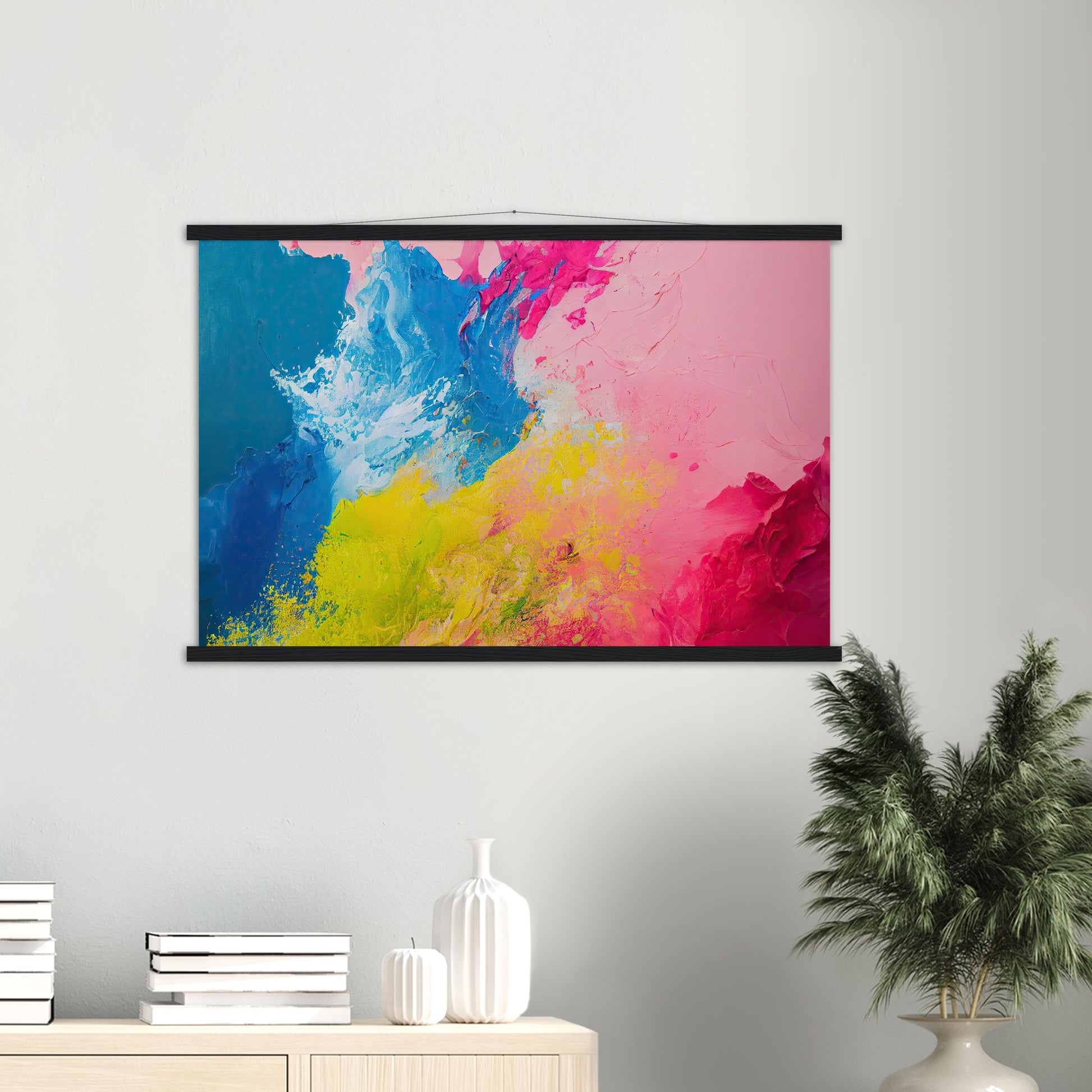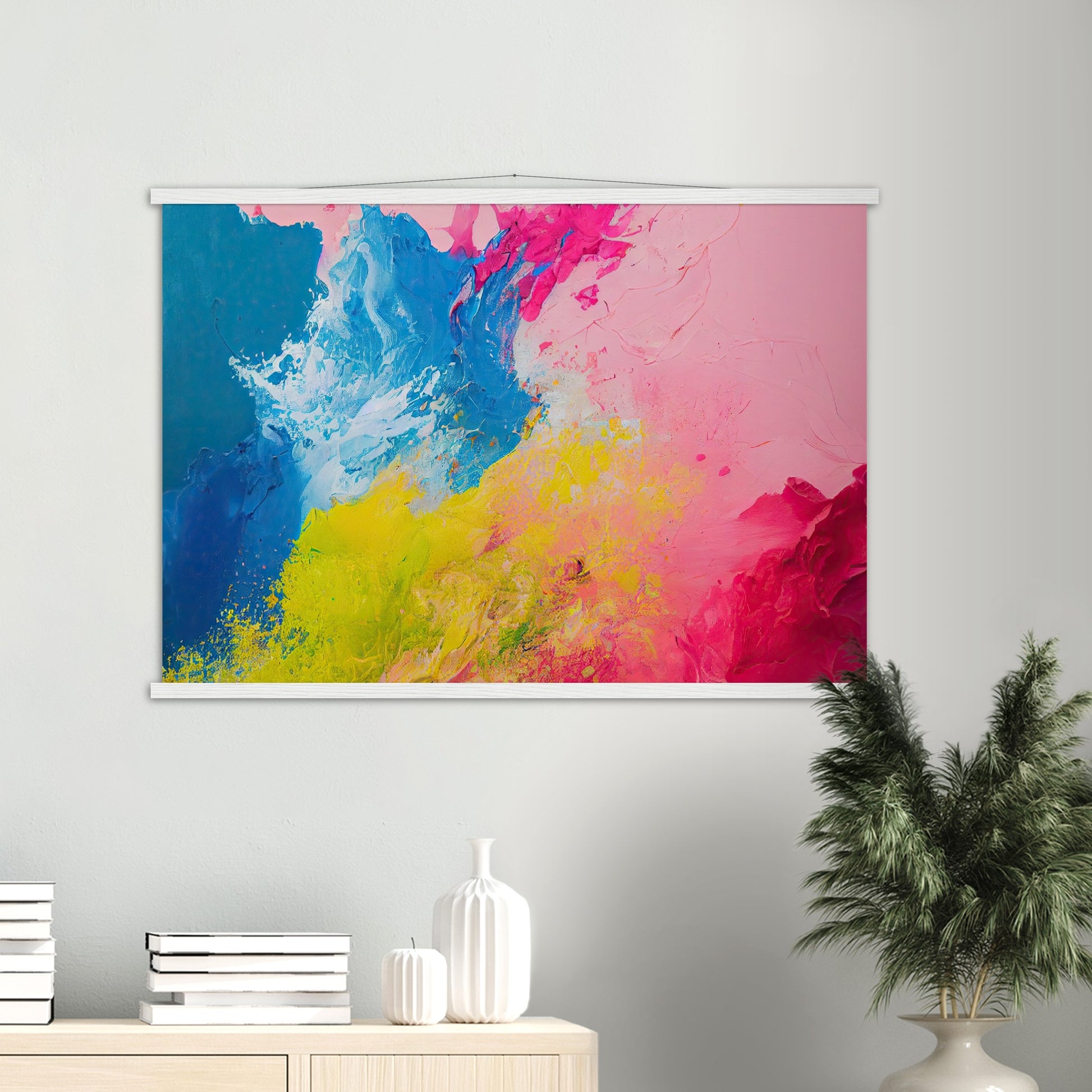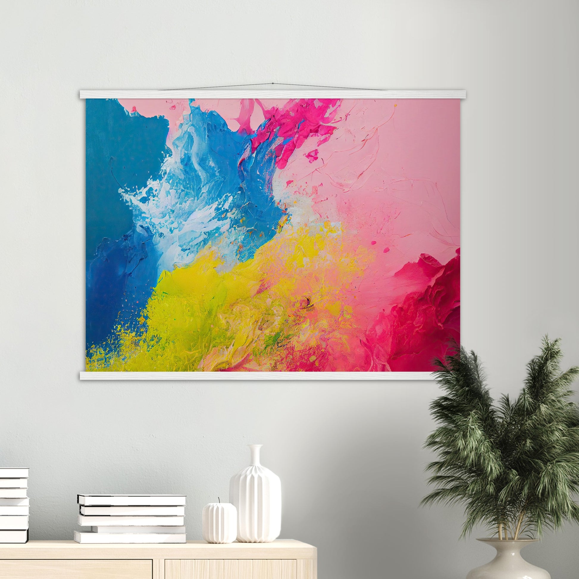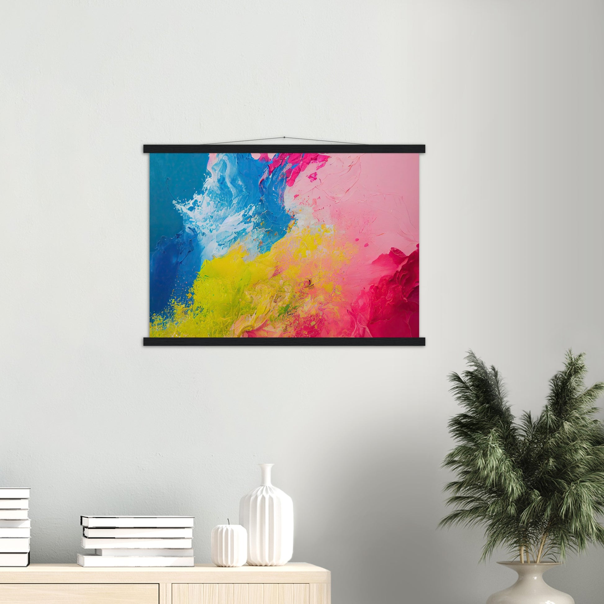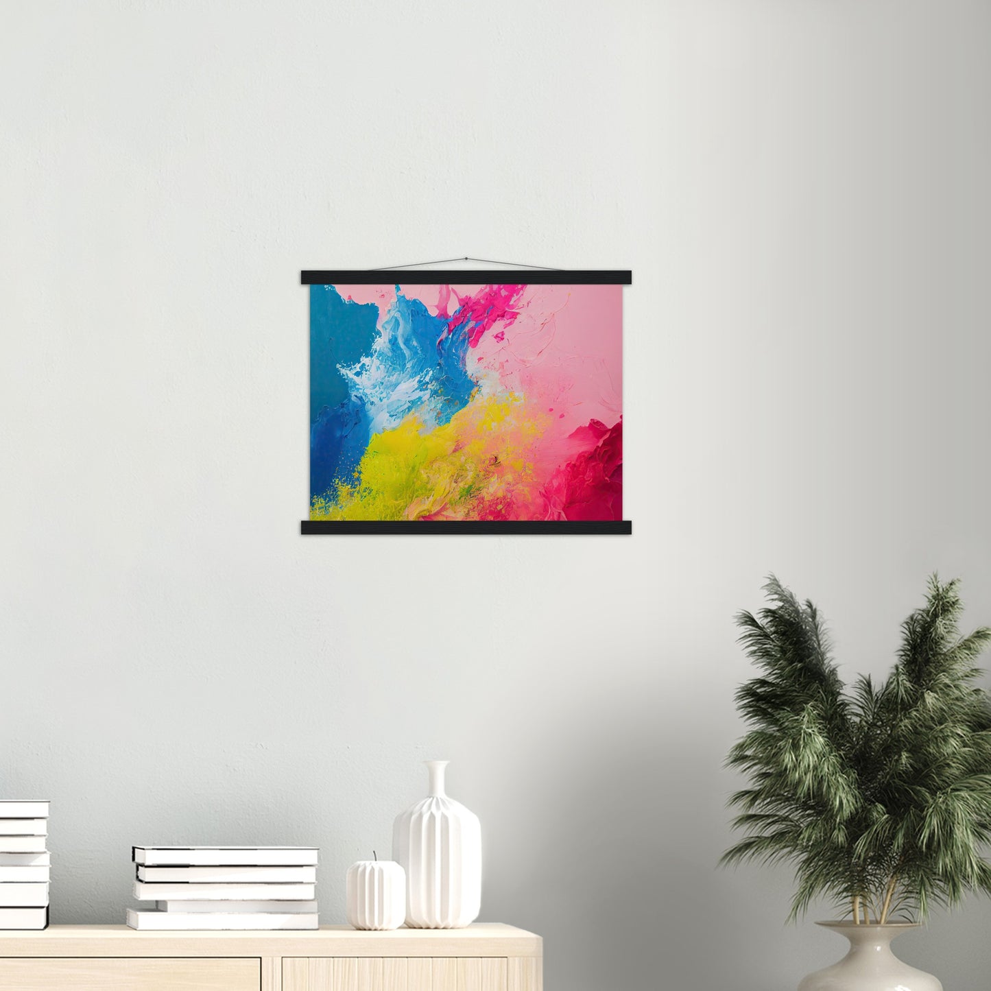 Ein hochwertiges Poster und ein wunderschöner Leistenaufhänger. Jede Aufhänger enthält vier Holzleisten, zwei, die die Oberseite des Drucks festklemmen, und zwei, die die Unterseite festklemmen, sowie eine hochwertige Baumwollschnur, die zur Farbe der Leisten passt. Starke Magnete halten dein Kunstwerk sicher fest und ermöglichen es dem Kunden, das Kunstwerk bei Bedarf zu wechseln.