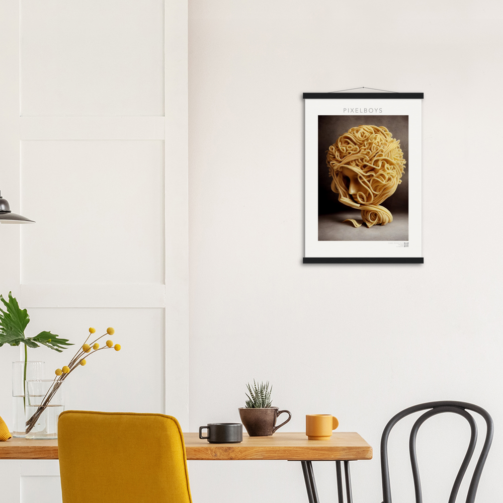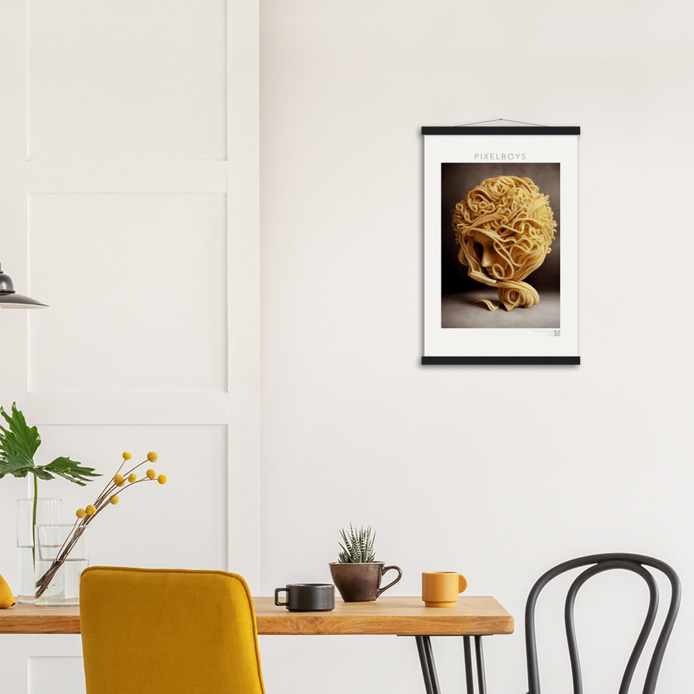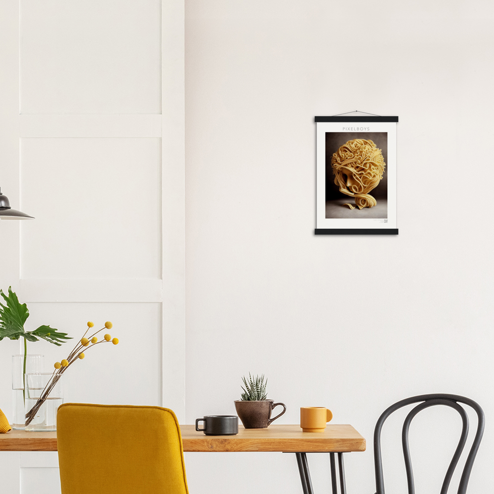 Ein hochwertiges Poster und ein wunderschöner Leistenaufhänger. Jede Aufhänger enthält vier Holzleisten, zwei, die die Oberseite des Drucks festklemmen, und zwei, die die Unterseite festklemmen, sowie eine hochwertige Baumwollschnur, die zur Farbe der Leisten passt. Starke Magnete halten dein Kunstwerk sicher fest und ermöglichen es dem Kunden, das Kunstwerk bei Bedarf zu wechseln.