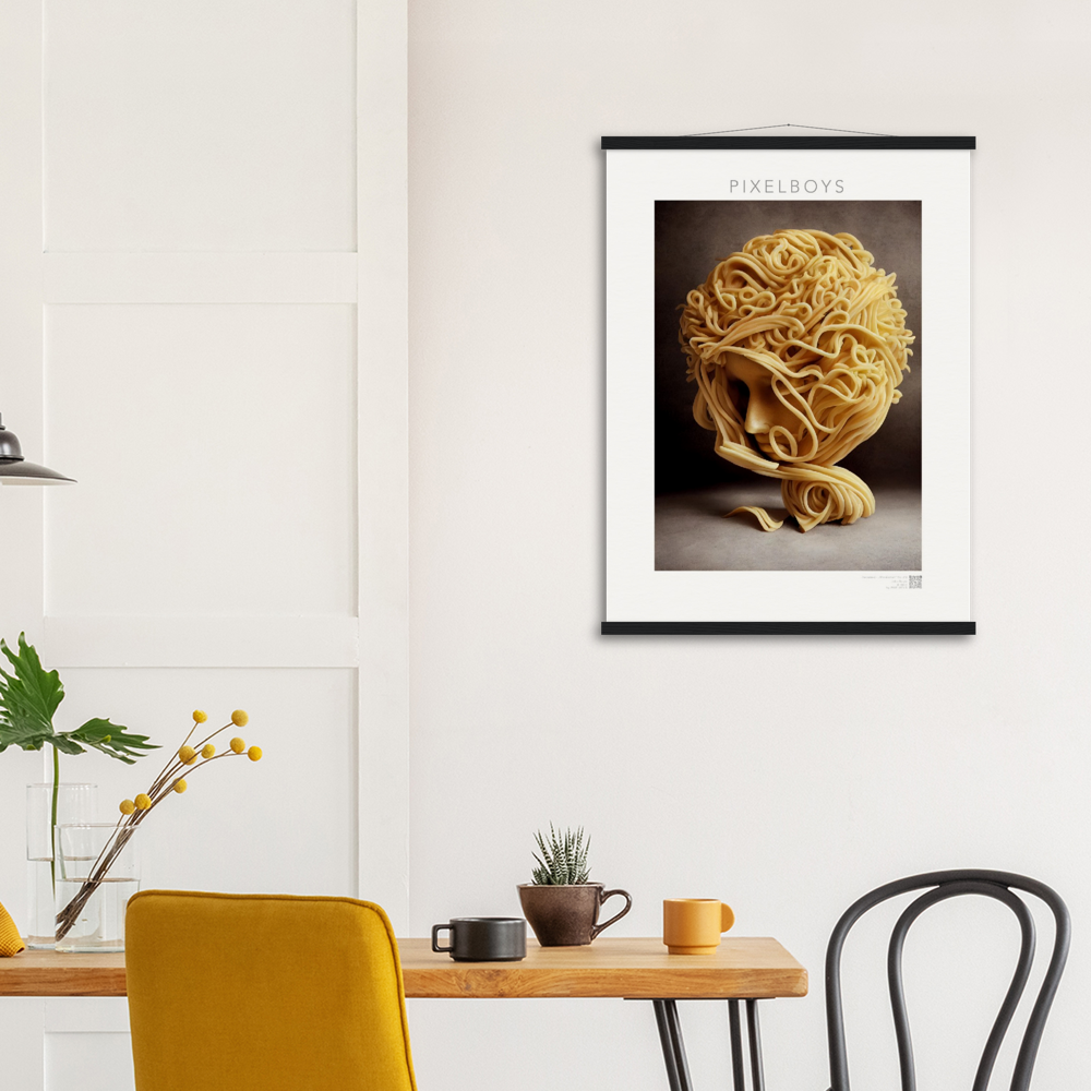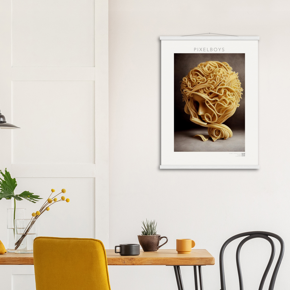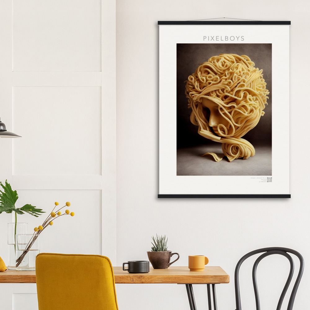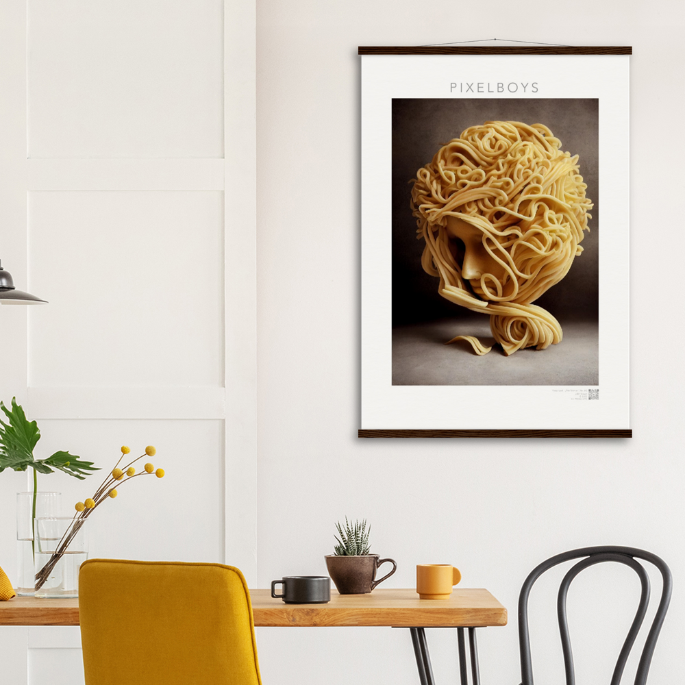 Ein hochwertiges Poster und ein wunderschöner Leistenaufhänger. Jede Aufhänger enthält vier Holzleisten, zwei, die die Oberseite des Drucks festklemmen, und zwei, die die Unterseite festklemmen, sowie eine hochwertige Baumwollschnur, die zur Farbe der Leisten passt. Starke Magnete halten dein Kunstwerk sicher fest und ermöglichen es dem Kunden, das Kunstwerk bei Bedarf zu wechseln.