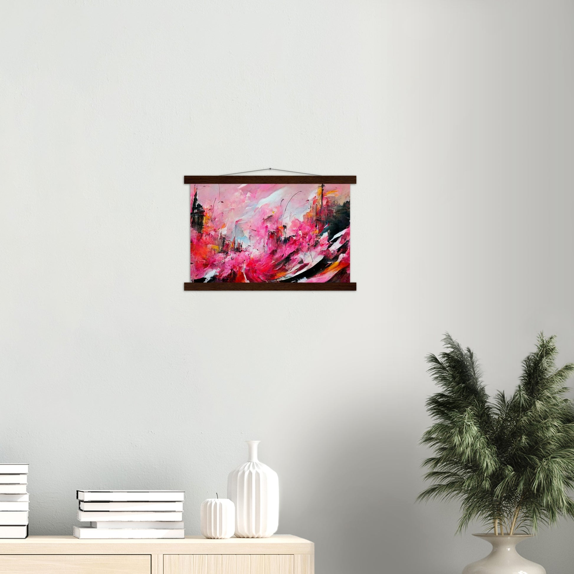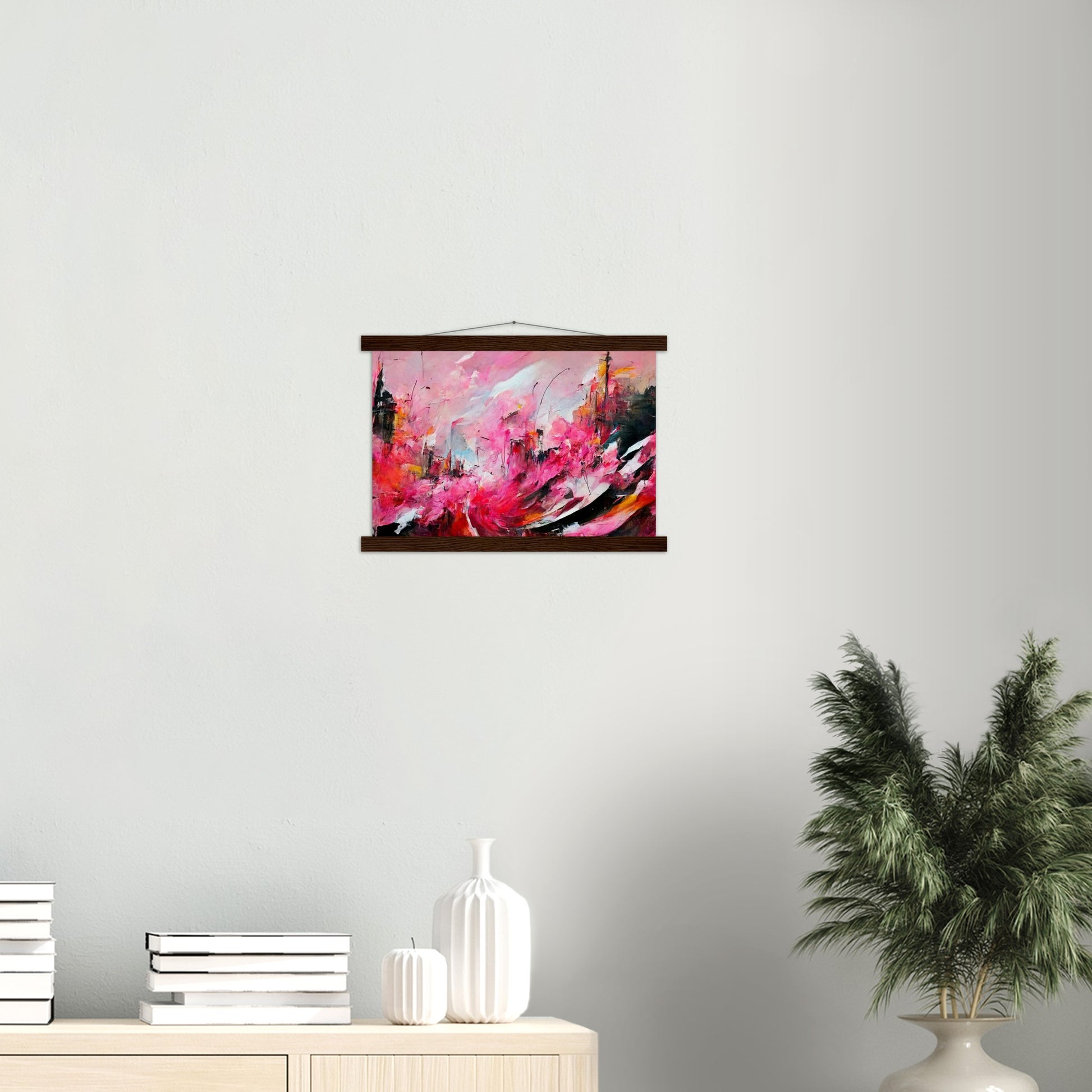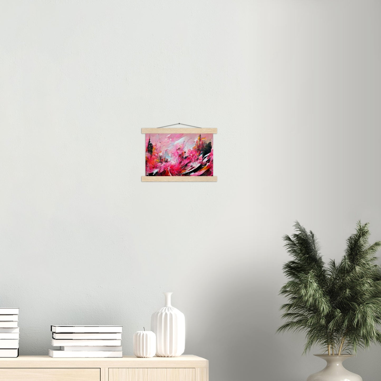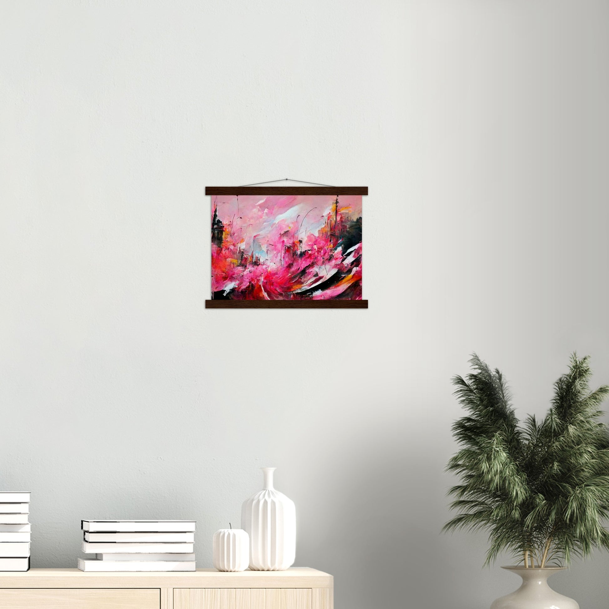 Ein hochwertiges Poster und ein wunderschöner Leistenaufhänger. Jede Aufhänger enthält vier Holzleisten, zwei, die die Oberseite des Drucks festklemmen, und zwei, die die Unterseite festklemmen, sowie eine hochwertige Baumwollschnur, die zur Farbe der Leisten passt. Starke Magnete halten dein Kunstwerk sicher fest und ermöglichen es dem Kunden, das Kunstwerk bei Bedarf zu wechseln.