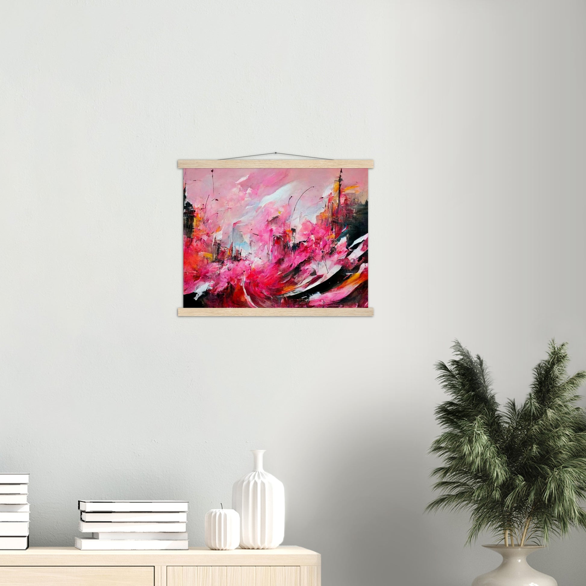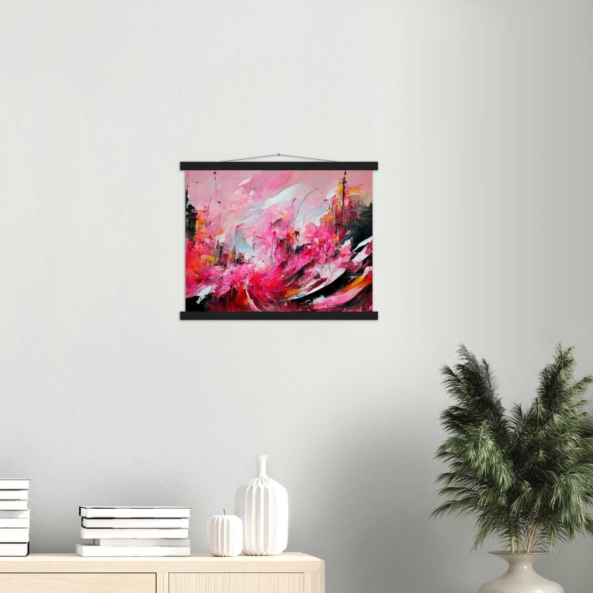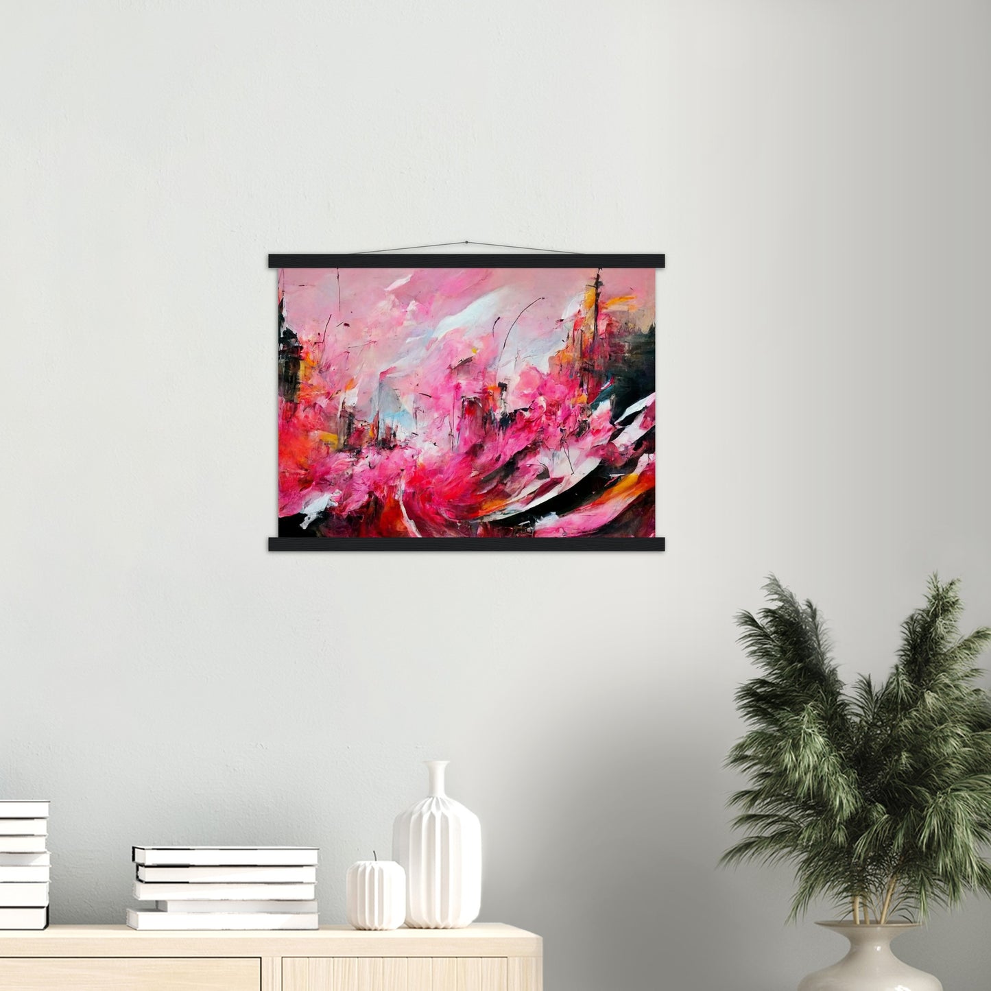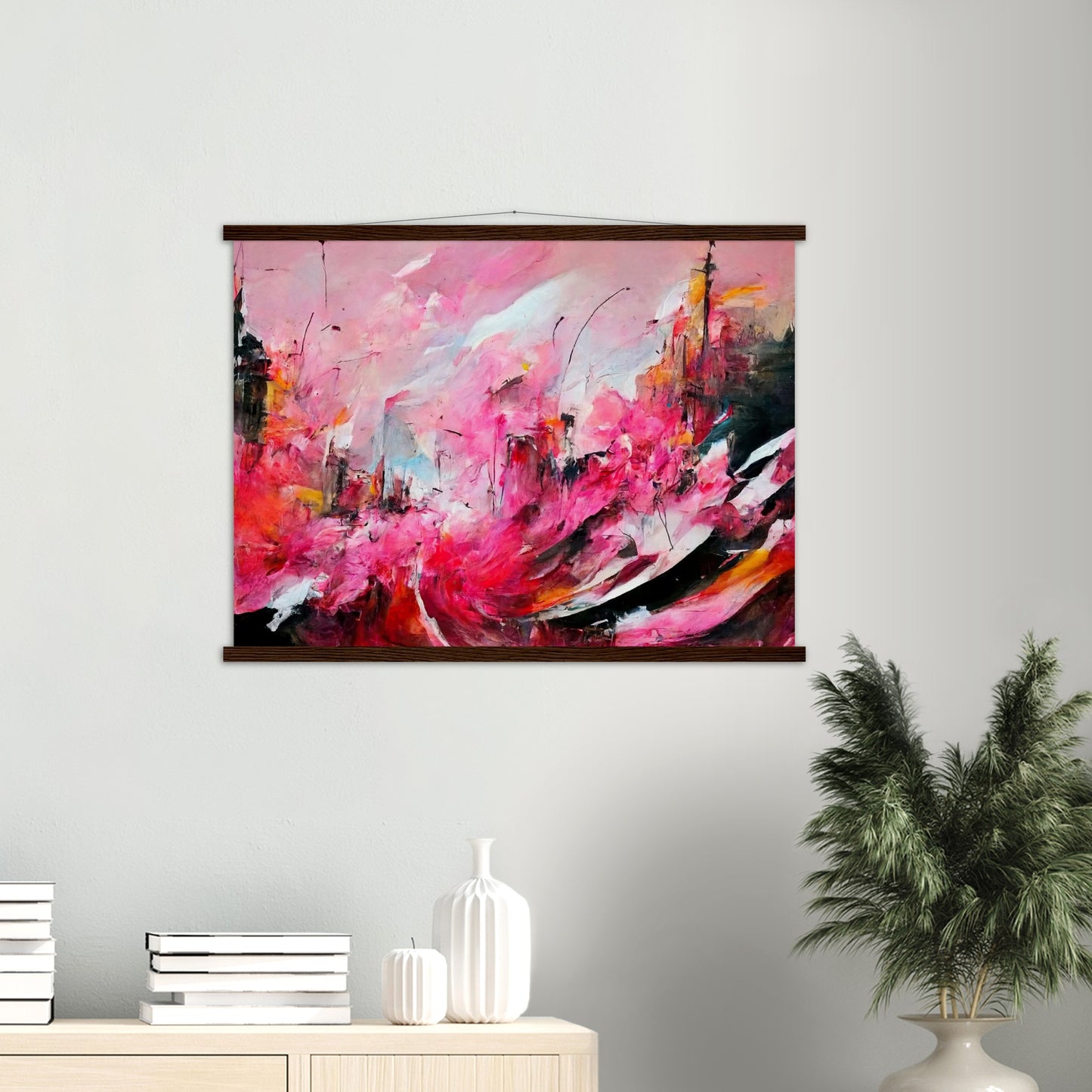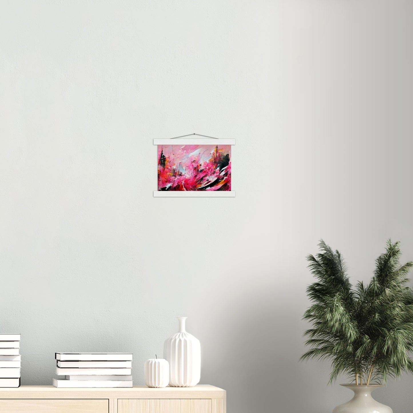 Ein hochwertiges Poster und ein wunderschöner Leistenaufhänger. Jede Aufhänger enthält vier Holzleisten, zwei, die die Oberseite des Drucks festklemmen, und zwei, die die Unterseite festklemmen, sowie eine hochwertige Baumwollschnur, die zur Farbe der Leisten passt. Starke Magnete halten dein Kunstwerk sicher fest und ermöglichen es dem Kunden, das Kunstwerk bei Bedarf zu wechseln.