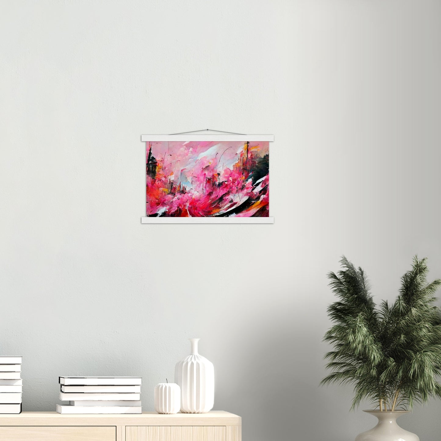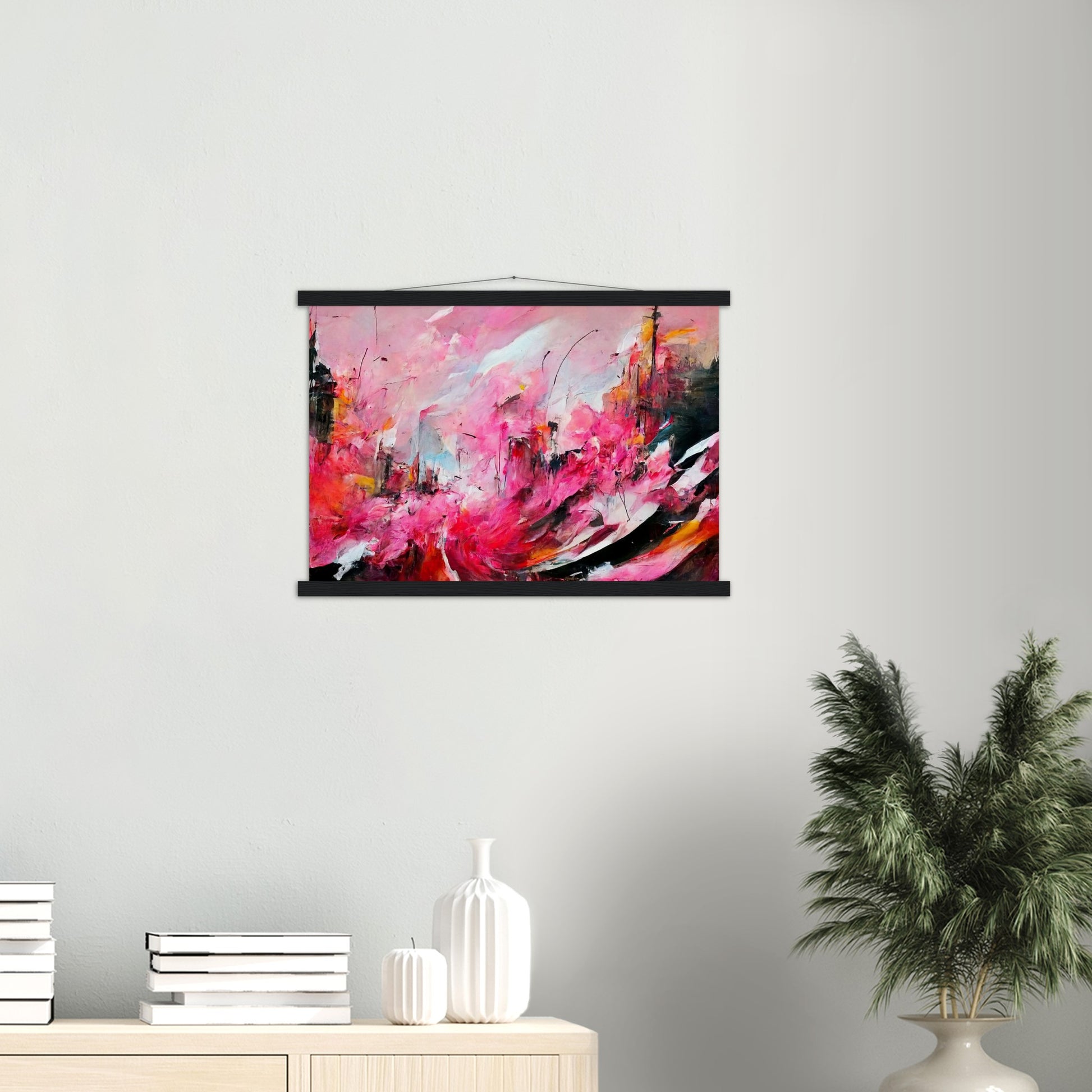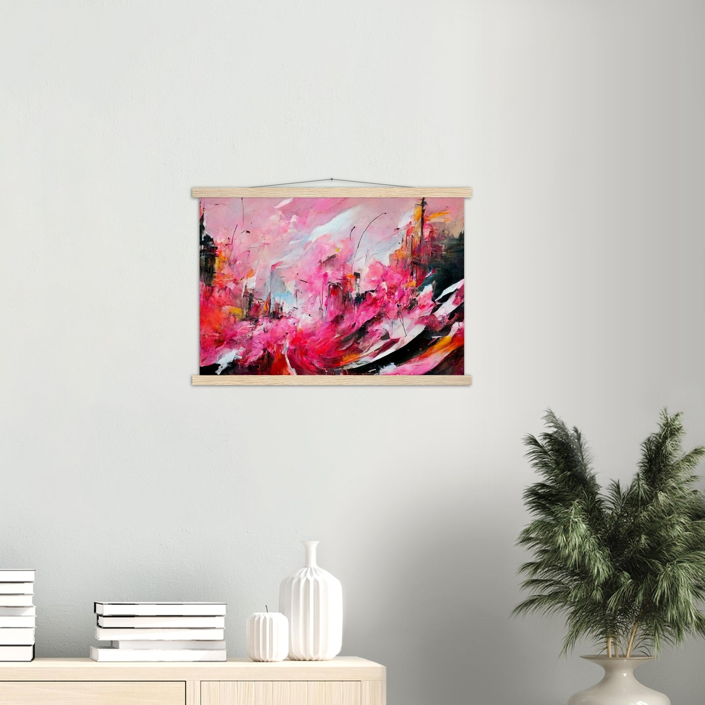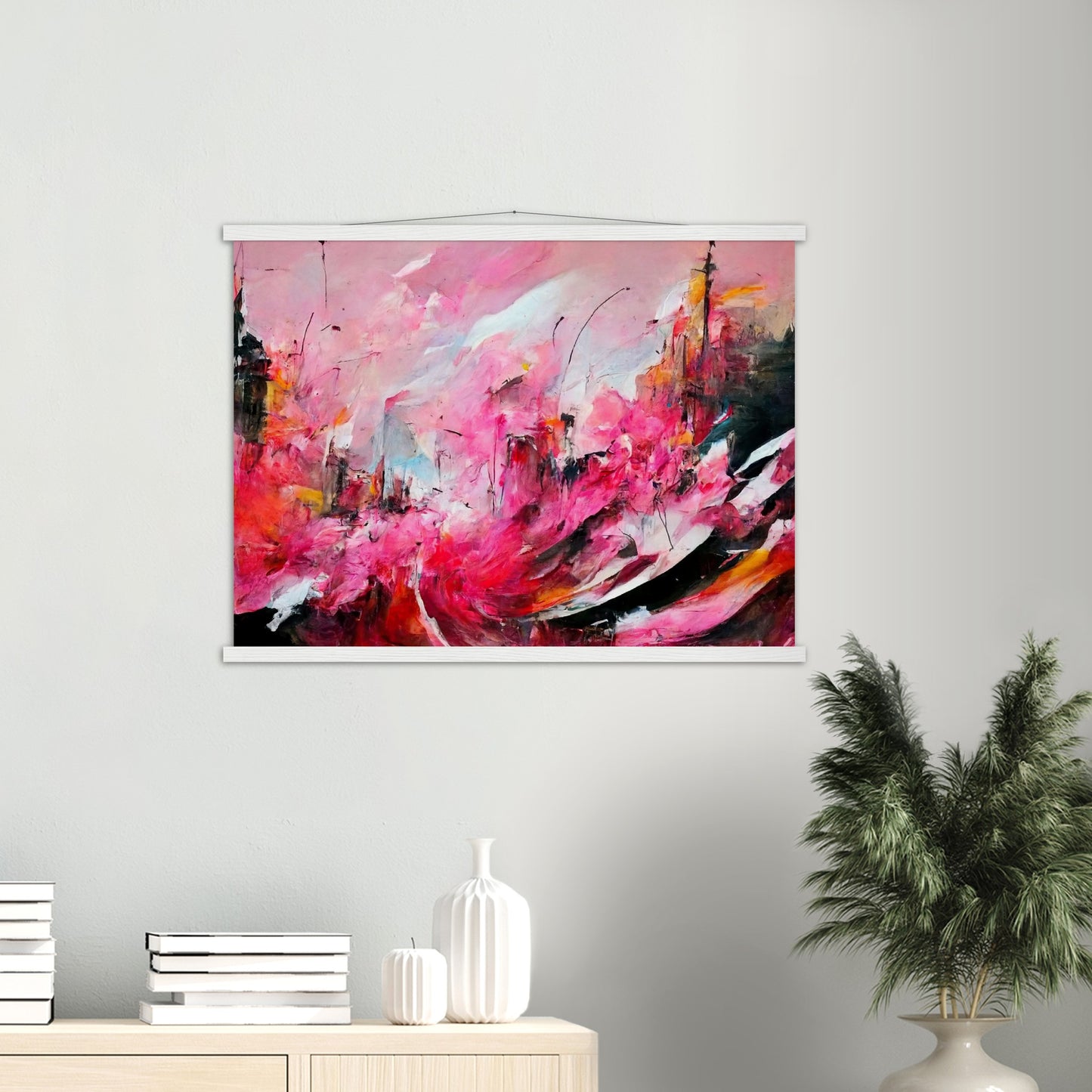 Ein hochwertiges Poster und ein wunderschöner Leistenaufhänger. Jede Aufhänger enthält vier Holzleisten, zwei, die die Oberseite des Drucks festklemmen, und zwei, die die Unterseite festklemmen, sowie eine hochwertige Baumwollschnur, die zur Farbe der Leisten passt. Starke Magnete halten dein Kunstwerk sicher fest und ermöglichen es dem Kunden, das Kunstwerk bei Bedarf zu wechseln.