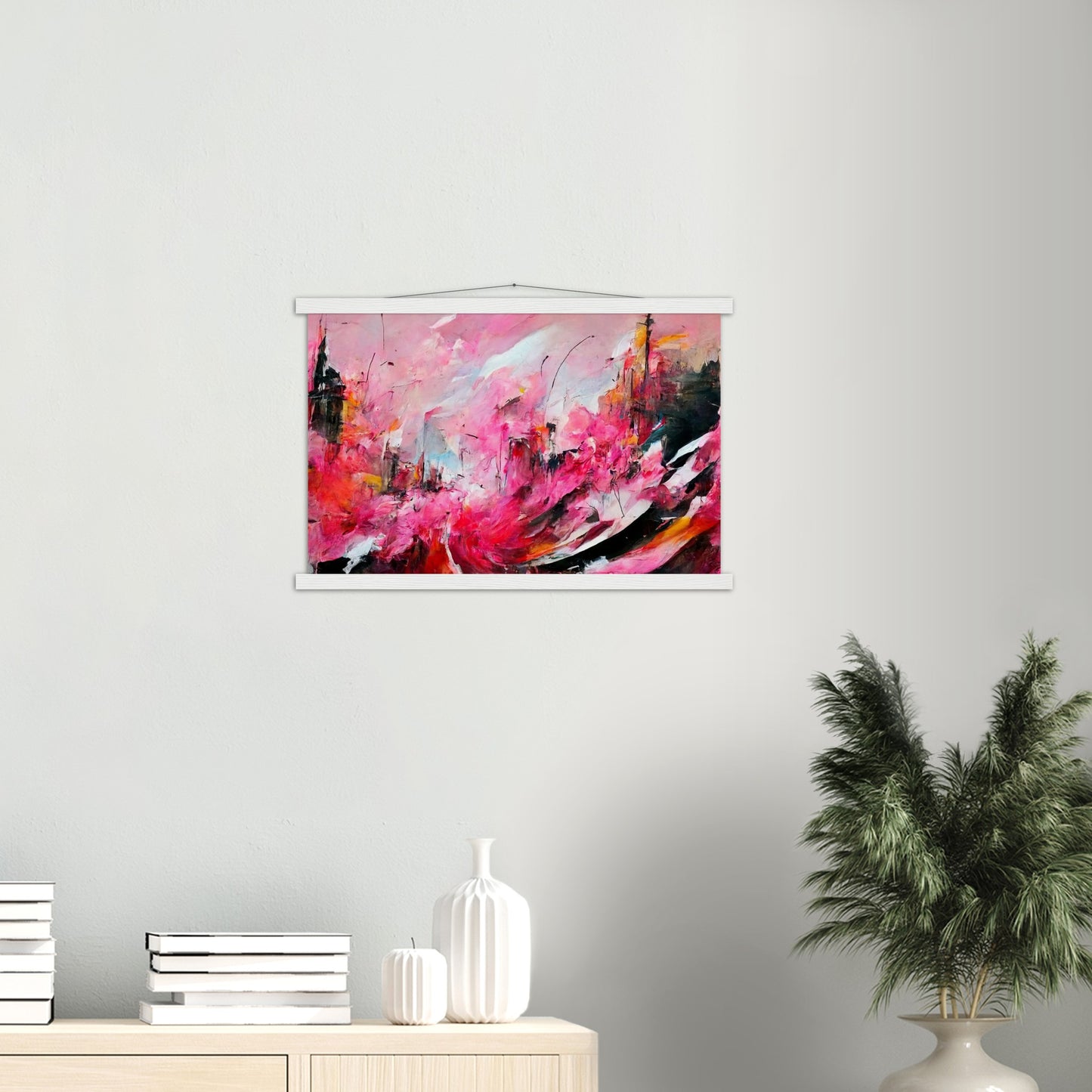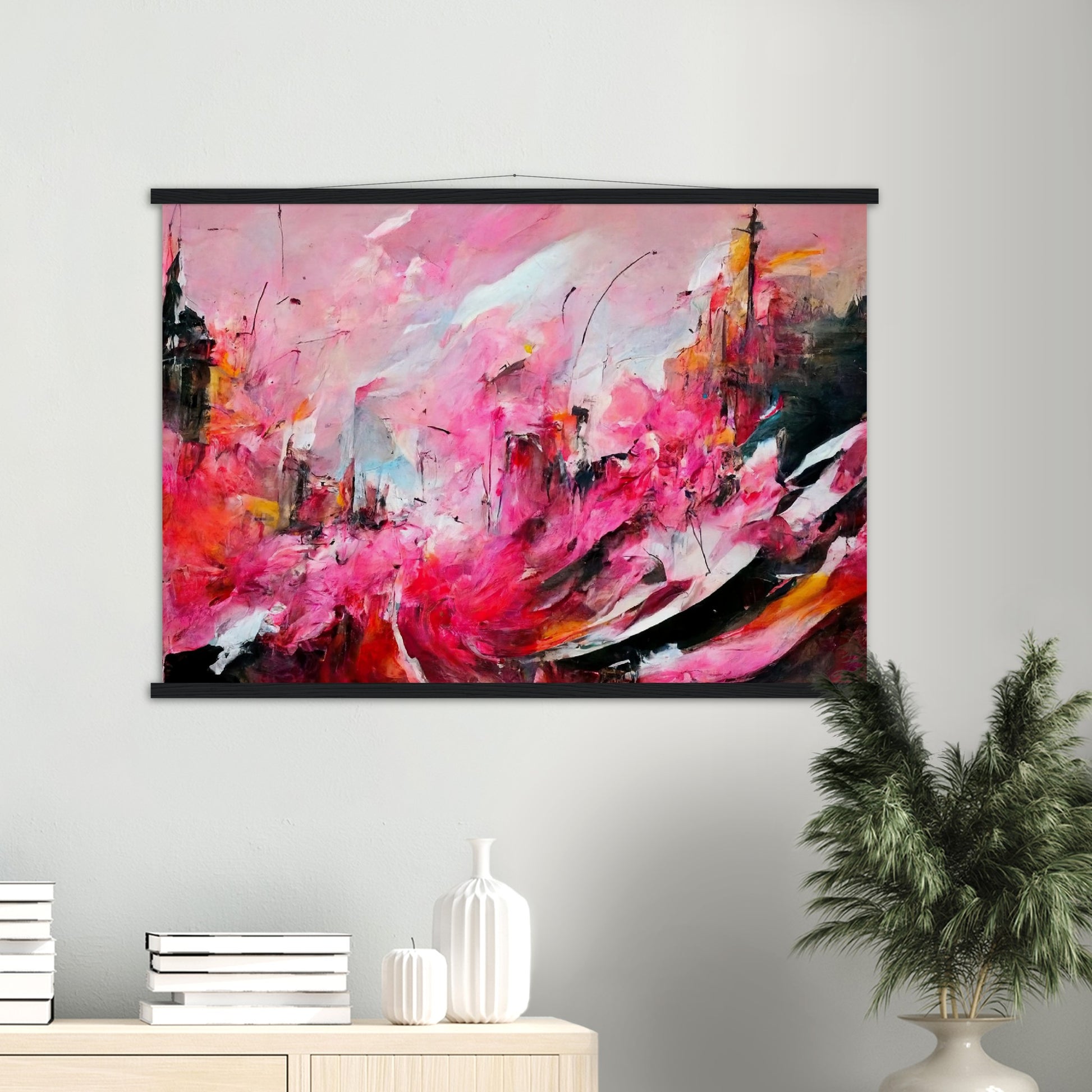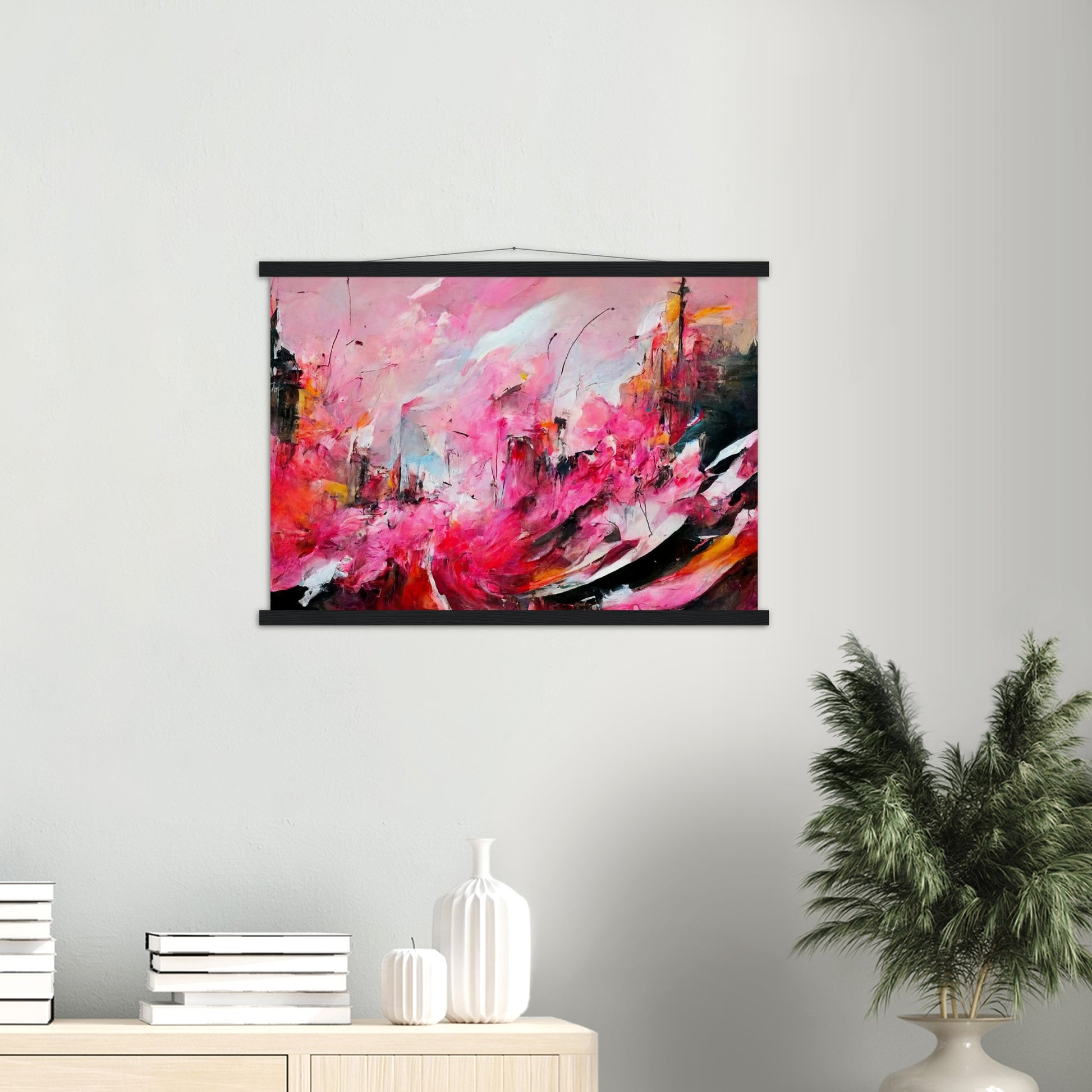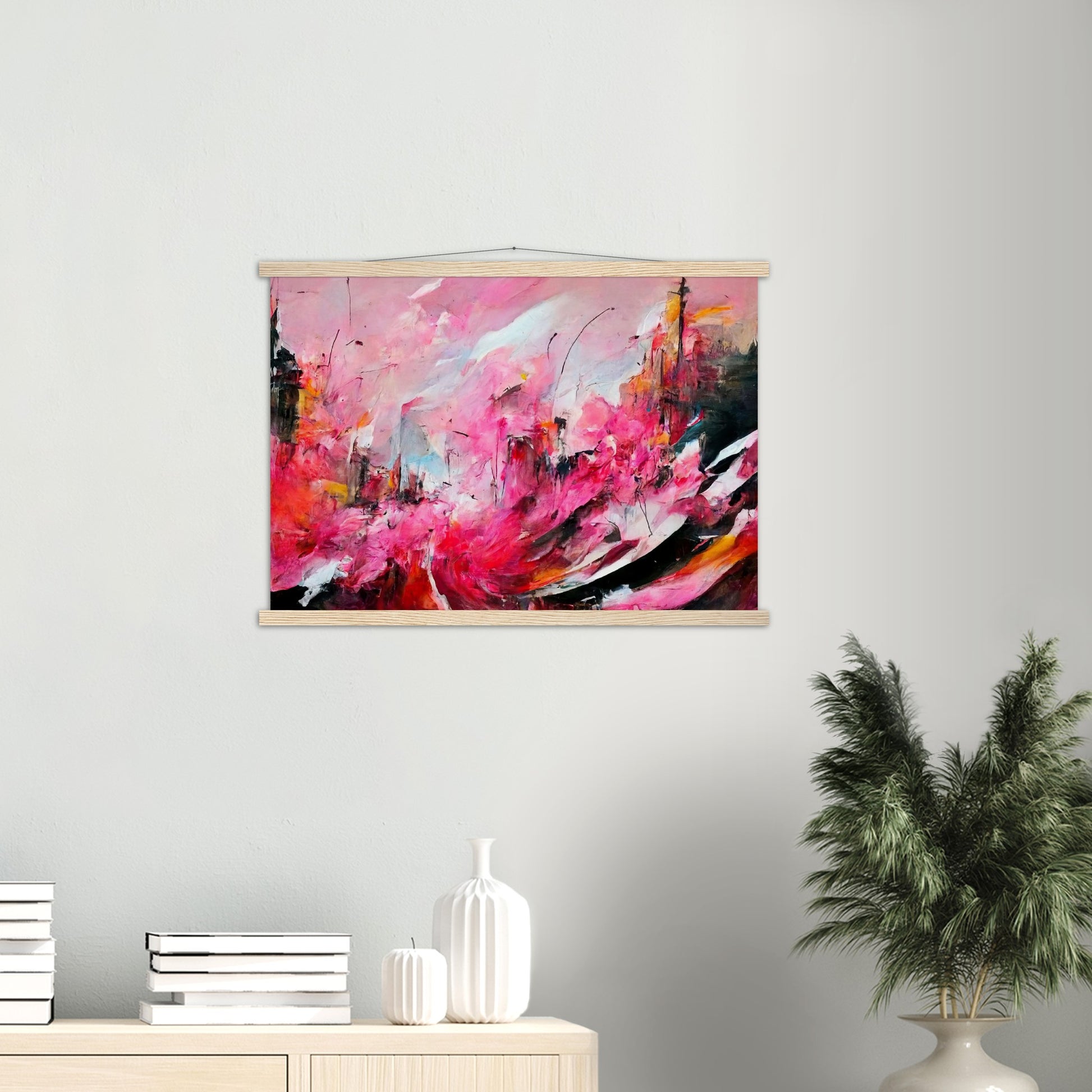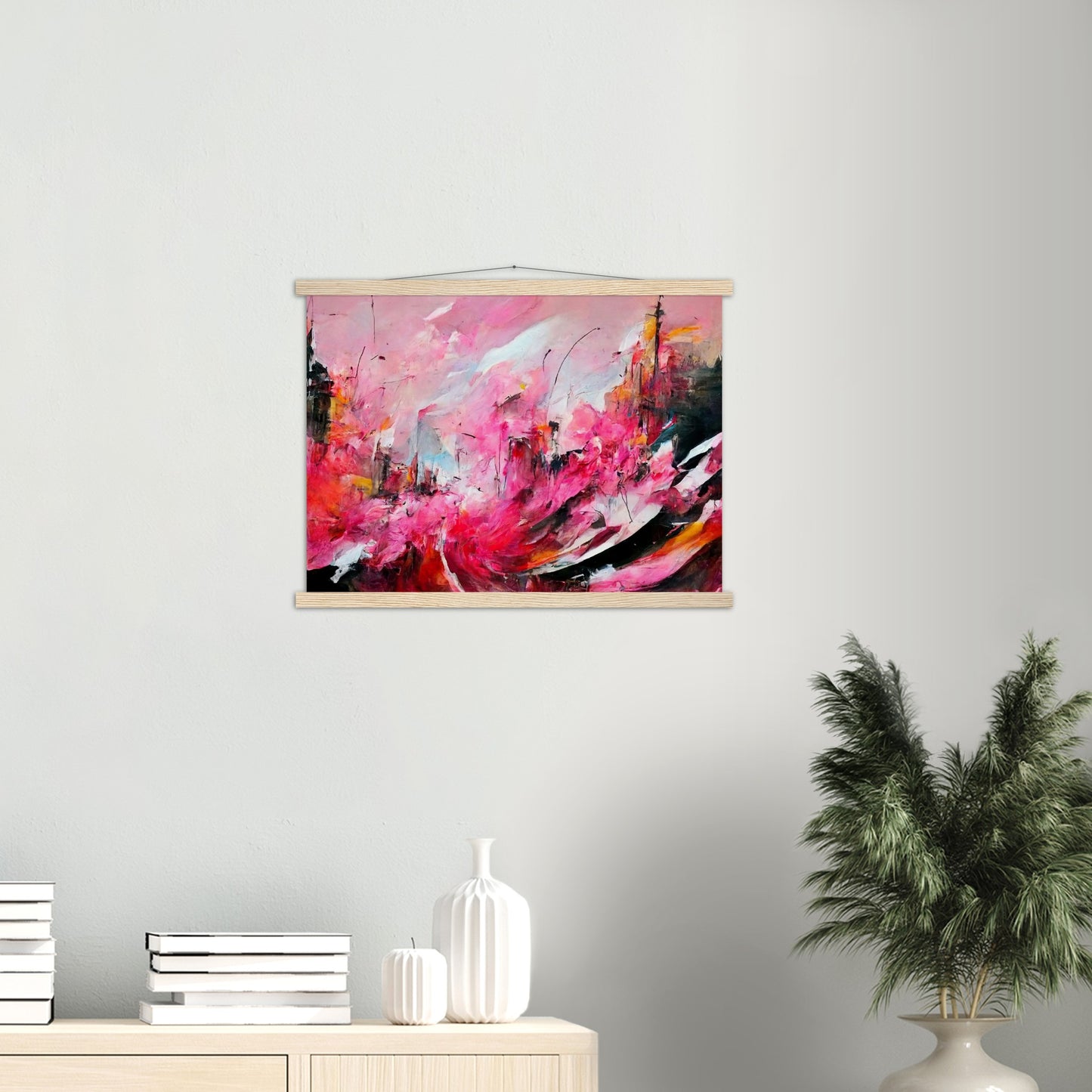 Ein hochwertiges Poster und ein wunderschöner Leistenaufhänger. Jede Aufhänger enthält vier Holzleisten, zwei, die die Oberseite des Drucks festklemmen, und zwei, die die Unterseite festklemmen, sowie eine hochwertige Baumwollschnur, die zur Farbe der Leisten passt. Starke Magnete halten dein Kunstwerk sicher fest und ermöglichen es dem Kunden, das Kunstwerk bei Bedarf zu wechseln.