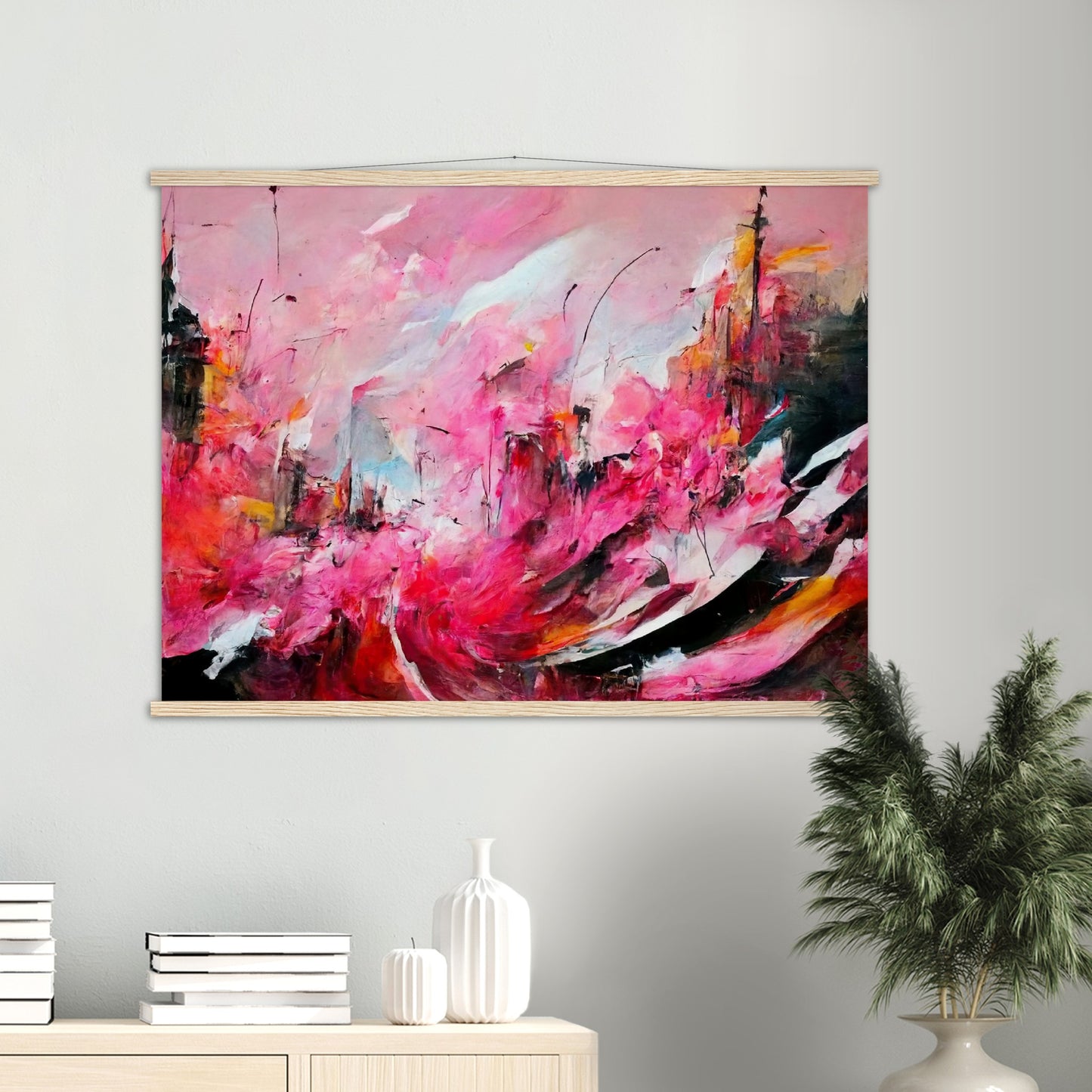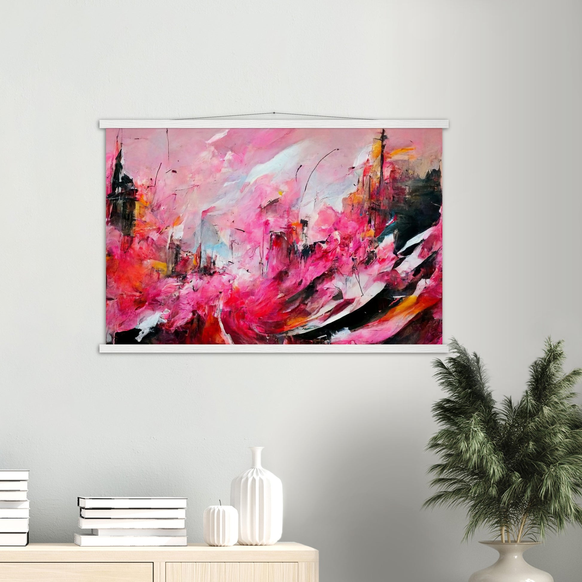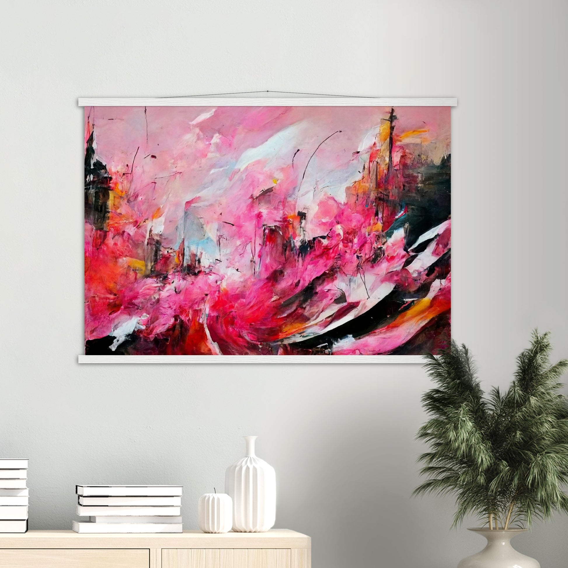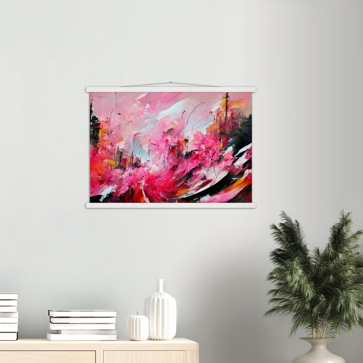 Ein hochwertiges Poster und ein wunderschöner Leistenaufhänger. Jede Aufhänger enthält vier Holzleisten, zwei, die die Oberseite des Drucks festklemmen, und zwei, die die Unterseite festklemmen, sowie eine hochwertige Baumwollschnur, die zur Farbe der Leisten passt. Starke Magnete halten dein Kunstwerk sicher fest und ermöglichen es dem Kunden, das Kunstwerk bei Bedarf zu wechseln.