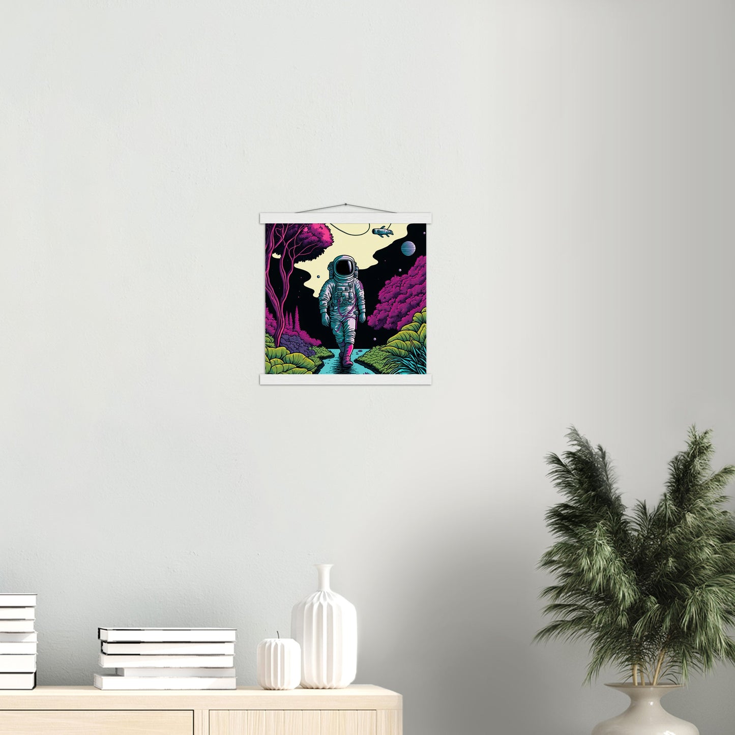 Ein hochwertiges Poster und ein wunderschöner Leistenaufhänger. Jede Aufhänger enthält vier Holzleisten, zwei, die die Oberseite des Drucks festklemmen, und zwei, die die Unterseite festklemmen, sowie eine hochwertige Baumwollschnur, die zur Farbe der Leisten passt. Starke Magnete halten dein Kunstwerk sicher fest und ermöglichen es dem Kunden, das Kunstwerk bei Bedarf zu wechseln.