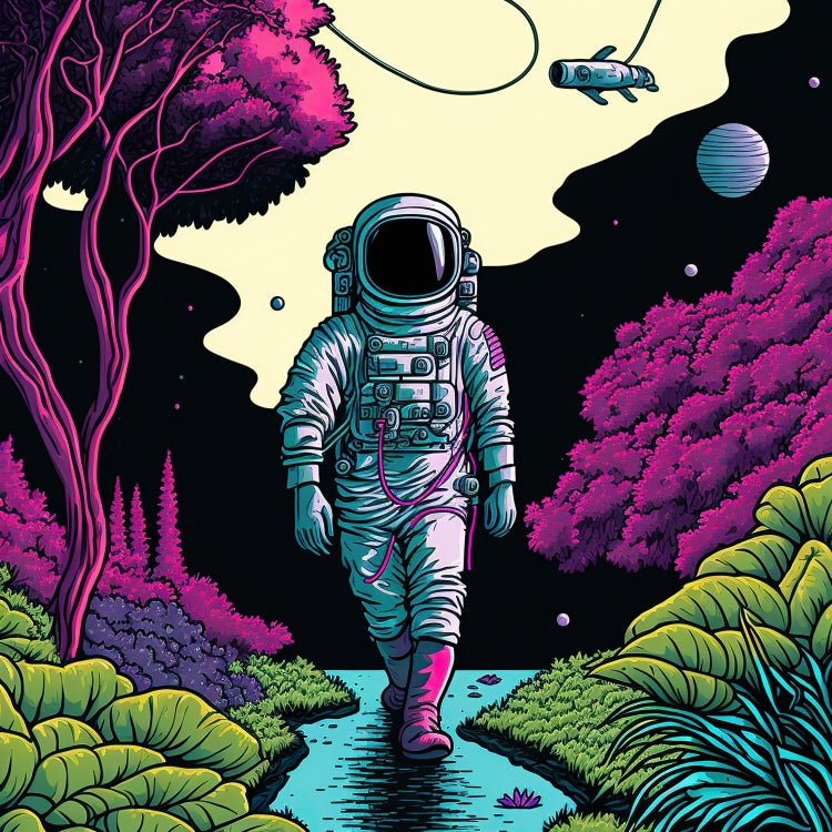 Kennen Sie noch den Song: „I’m walking.“? Ob unser Astronaut gerade singt, wissen wir nicht, aber er geht zumindest sehr selbstbewusst und relaxt auf den Betrachter zu. Im Himmel fliegt ein Alien-Fisch. Ein Planet ist zu erkennen. Ein Band aus Wolken liegt über der Nacht. Wie alle unsere Wandbilder ist auch diese Illustration exklusiv bei uns im Shop erhältlich. Der Astronaut ist Teil einer Reihe von Illustrationen, die Weltraumreisende in verschiedenen Situationen zeigen und kann perfekt mit anderen Bildern kombiniert werden. Schauen Sie auch unbedingt bei unseren bedruckten Tassen vorbei – da finden Sie alltägliches mit besonderer Kunst!