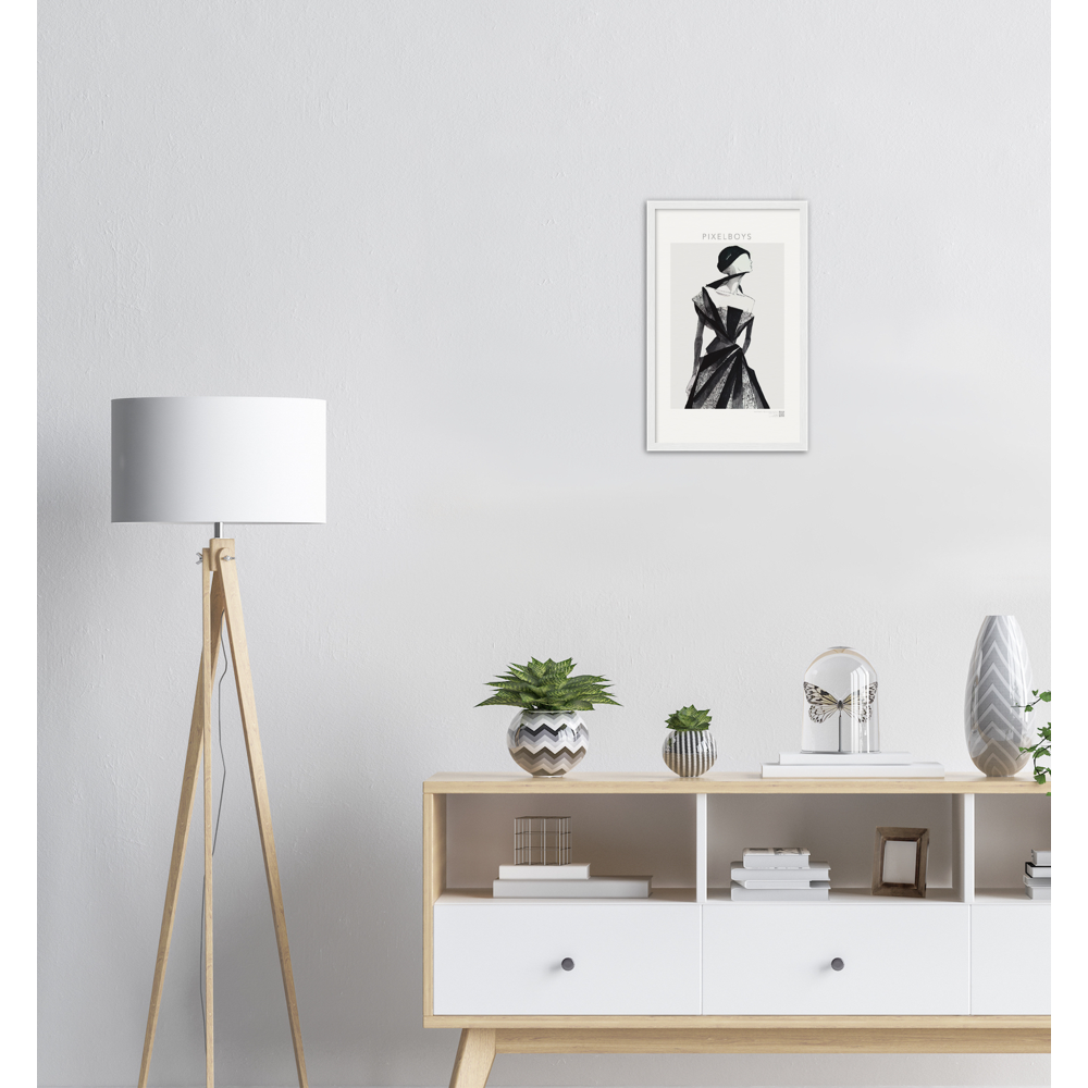 Ein gerahmtes Poster mit Papier in Museumsqualität (cremefarben), da bei der Herstellung keine optischen Aufheller verwendet werden, in einem schönen Rahmen.