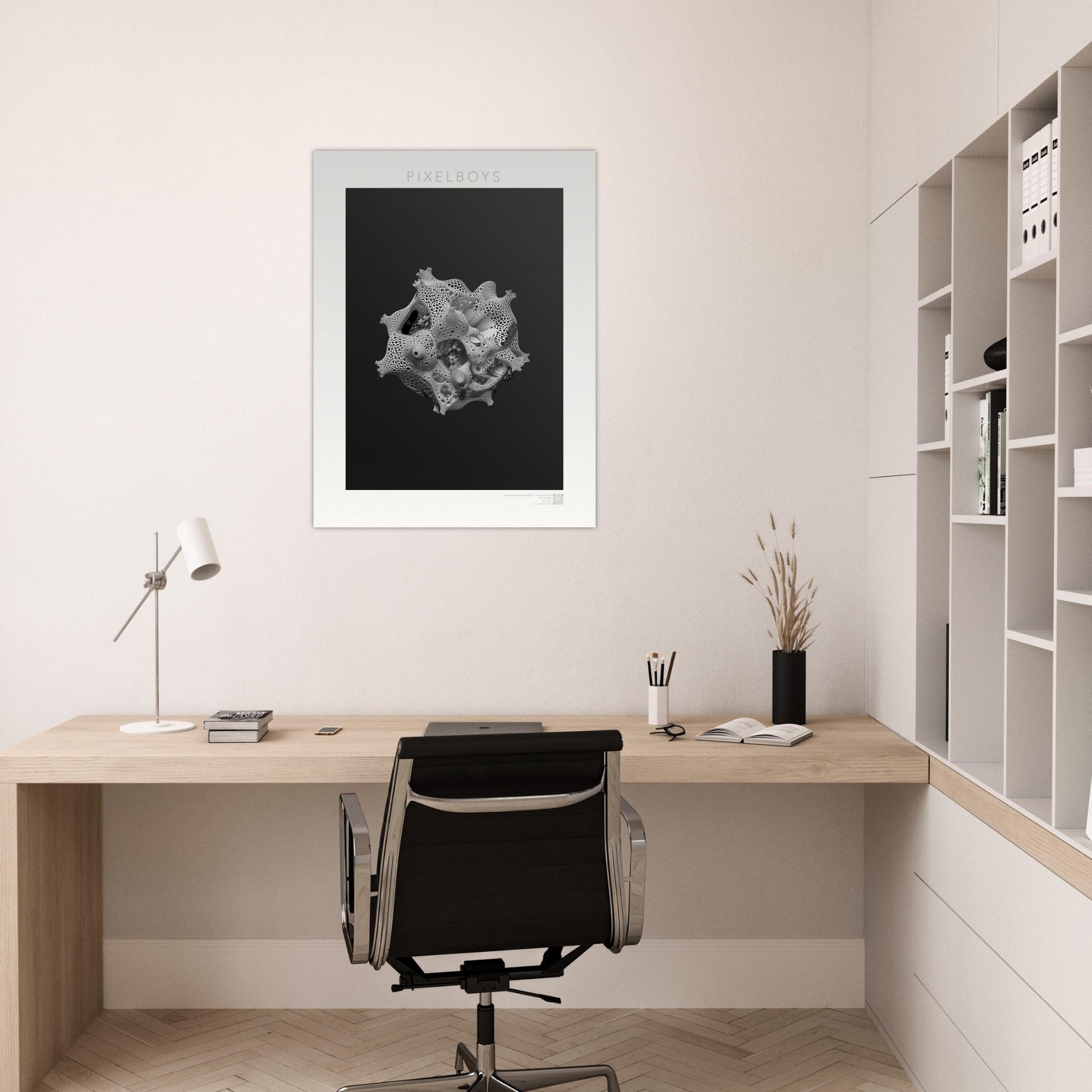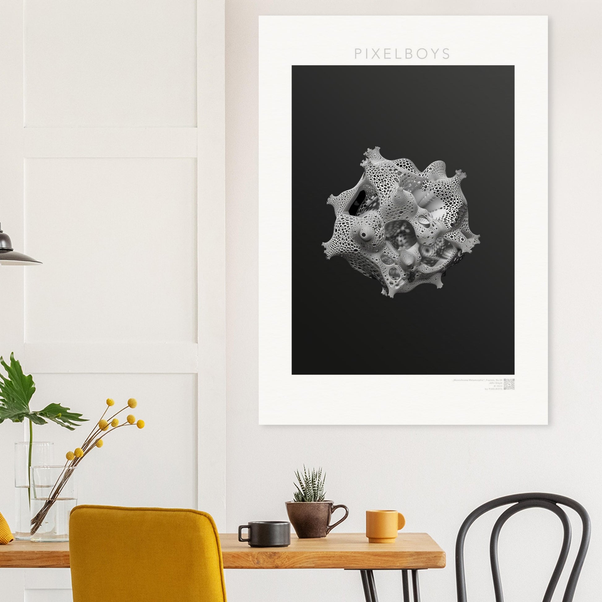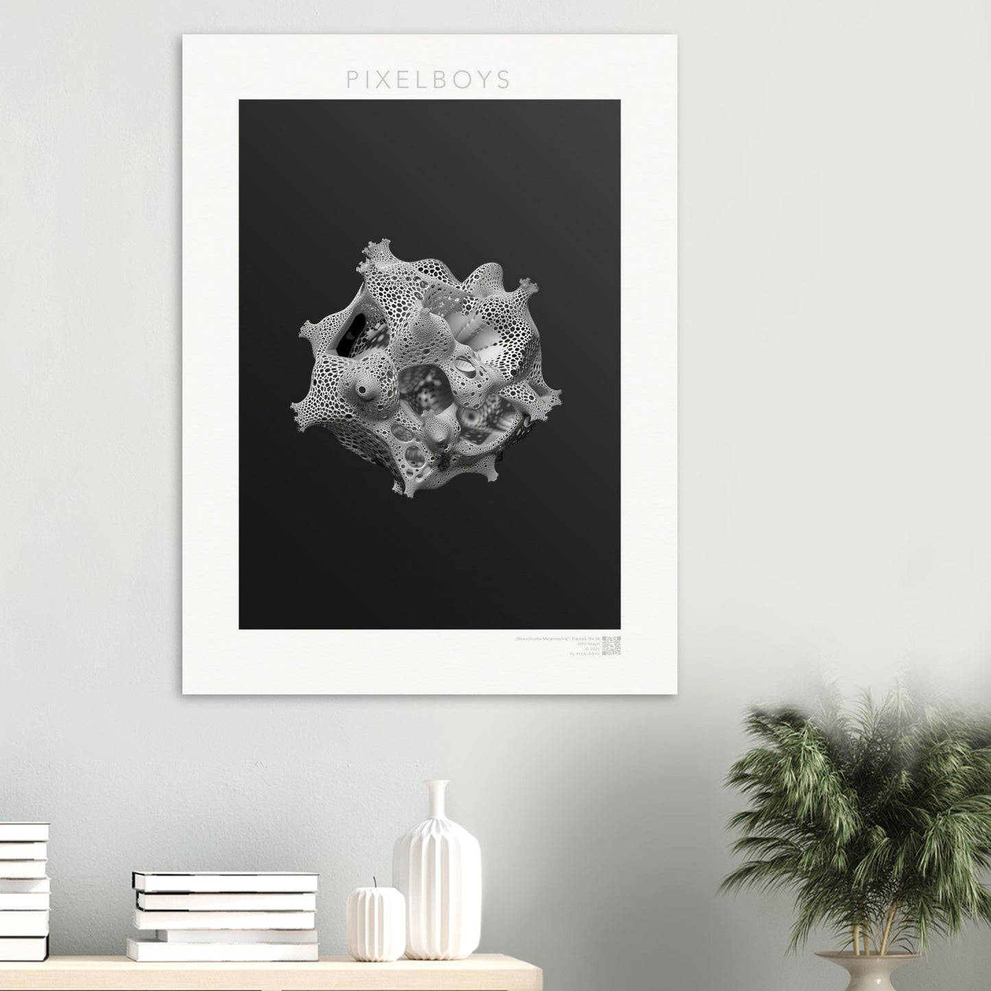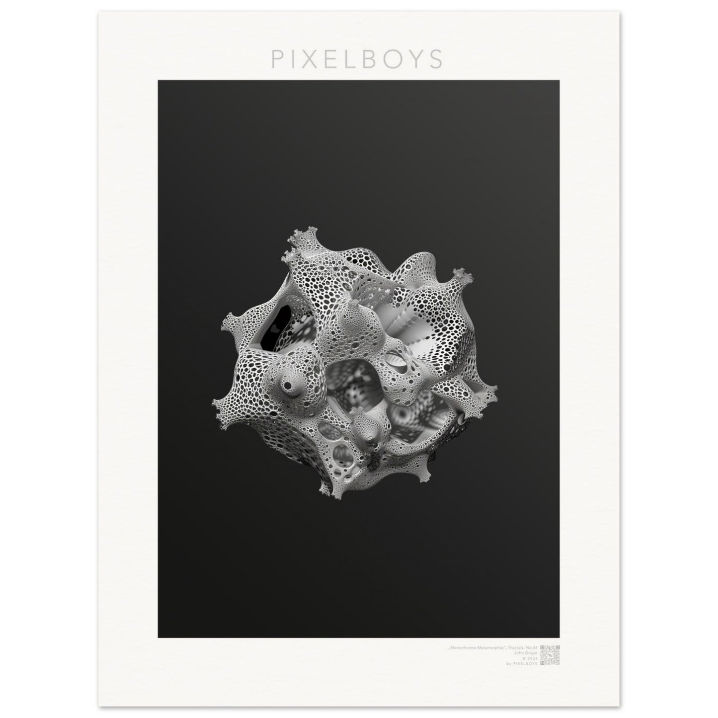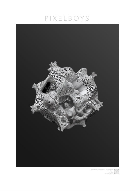 Monochrome Metamorphie ist ein meisterhaftes Poster von John Grayst, das die Eleganz der Mathematik mit der Ästhetik der visuellen Kunst verschmelzen lässt. Dieses faszinierende Fraktal-Kunstwerk, exklusiv erhältlich bei PIXELBOYS, ist ein Paradebeispiel für Graysts virtuoses Talent, komplexe Muster und Formen in atemberaubende Kunst zu übersetzen.