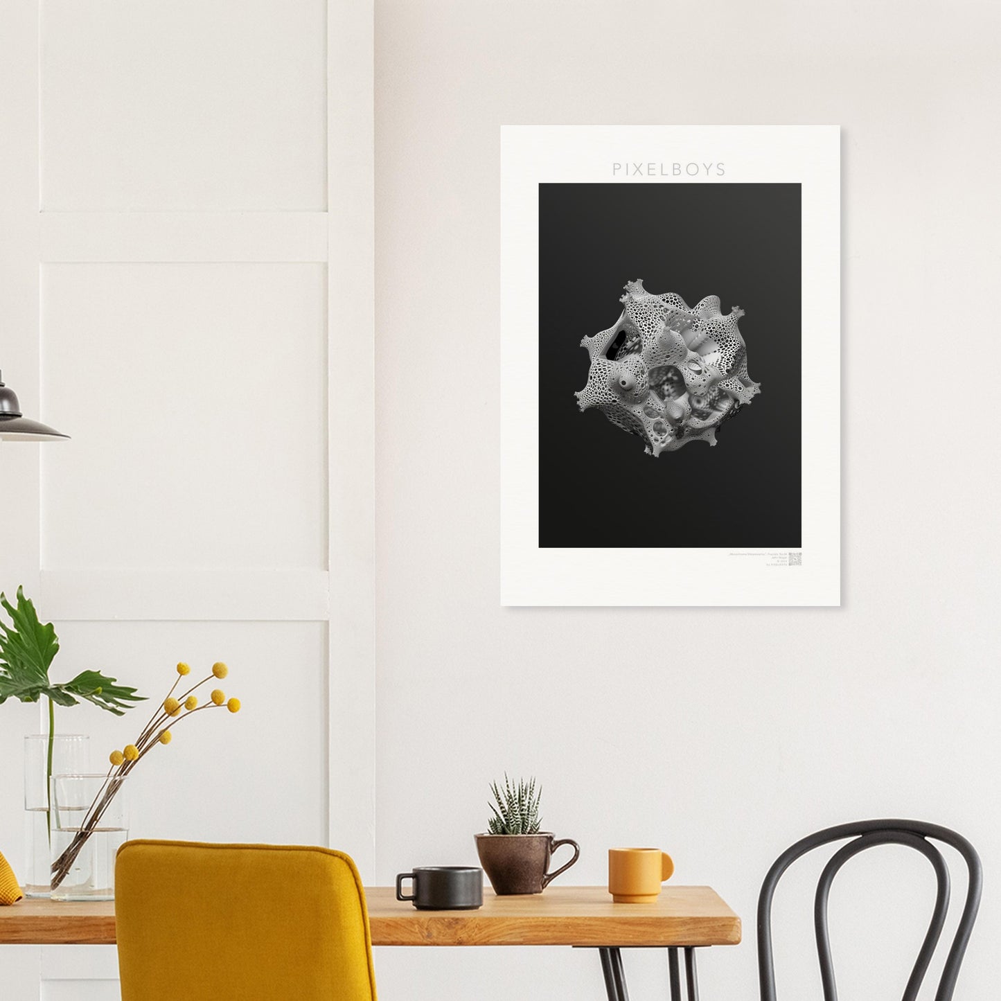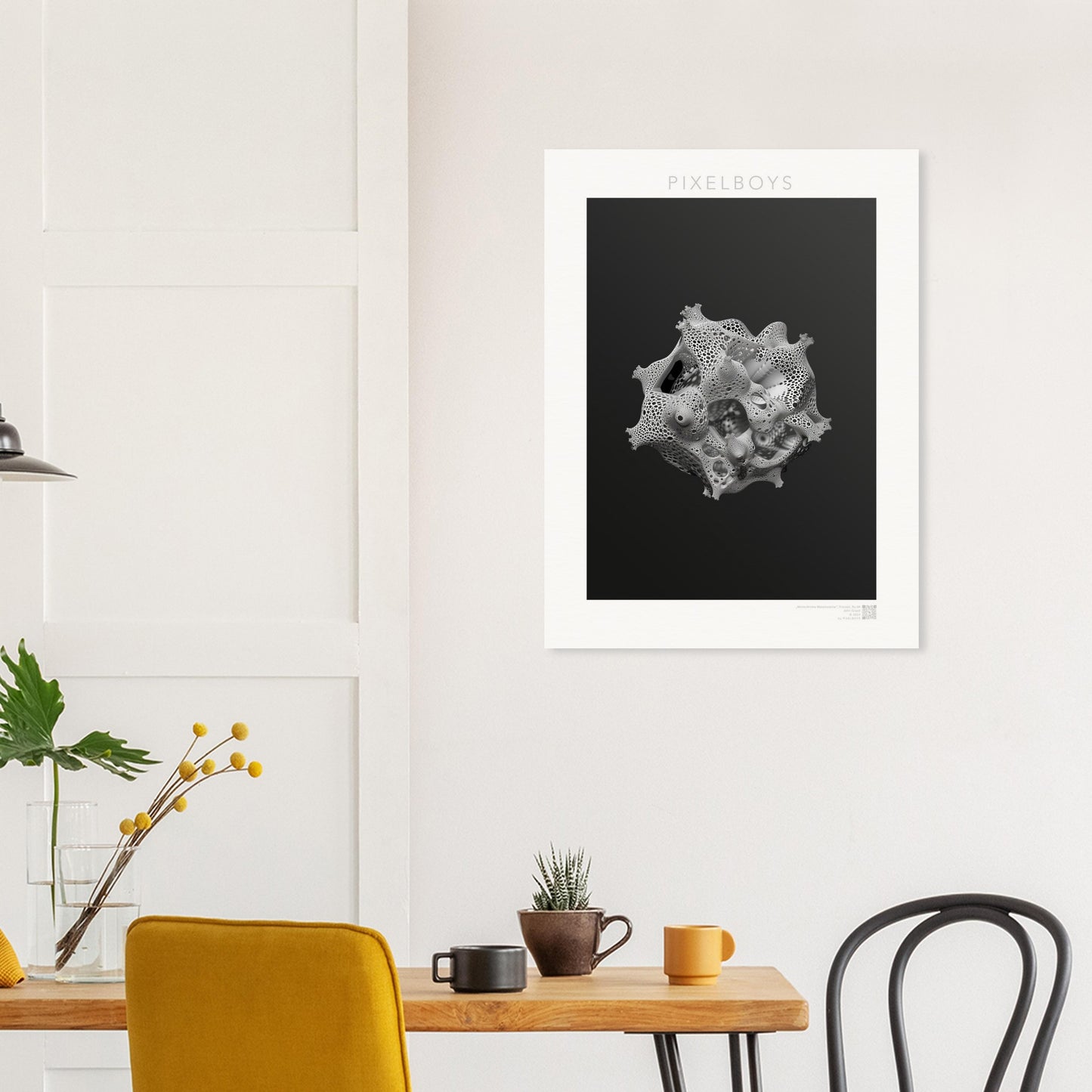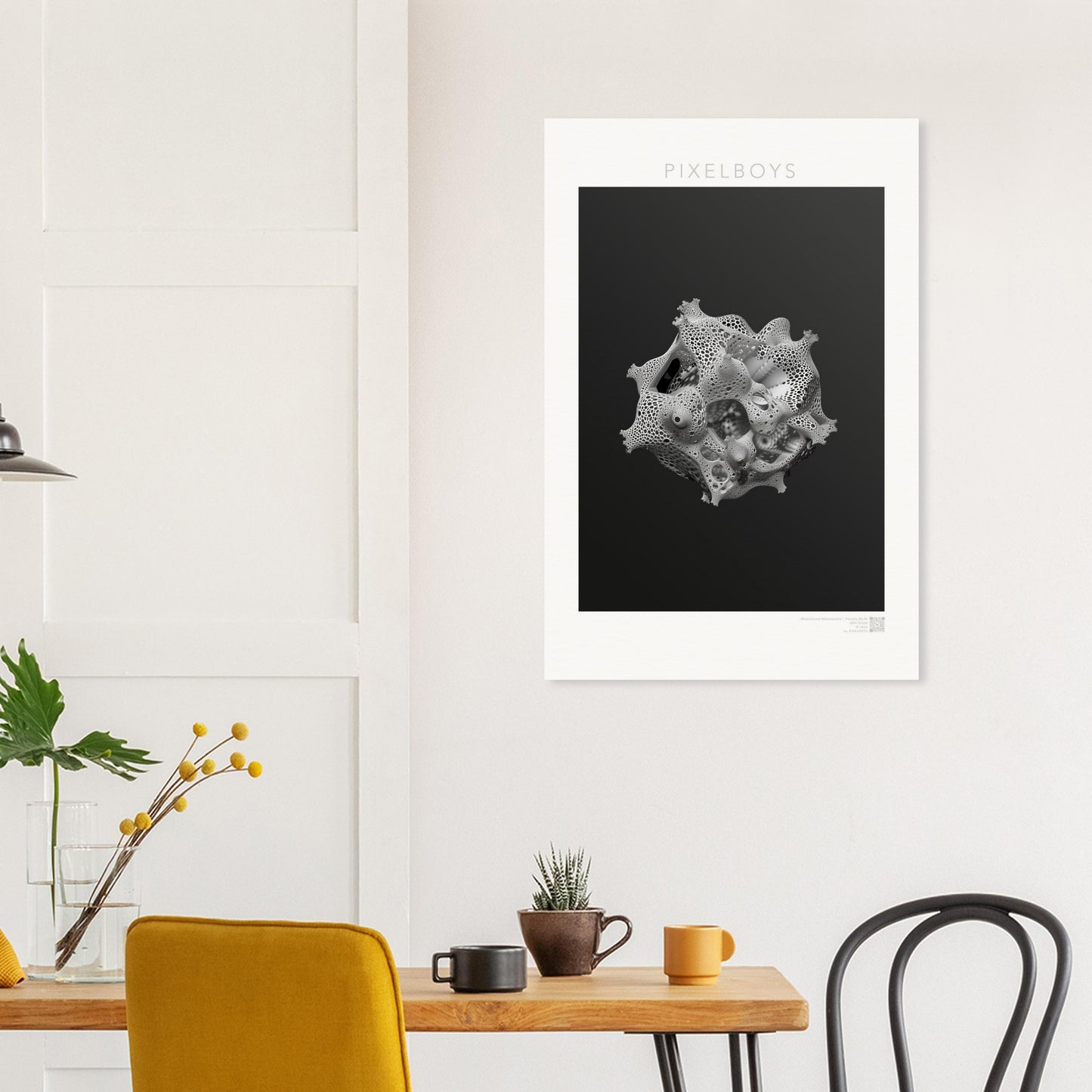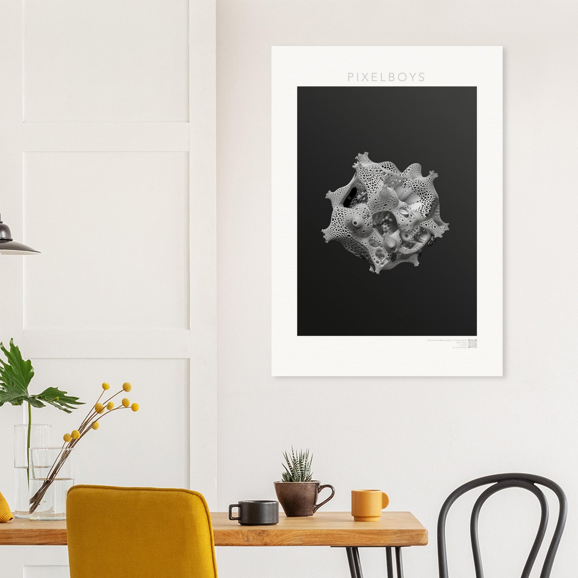 Monochrome Metamorphie ist ein meisterhaftes Poster von John Grayst, das die Eleganz der Mathematik mit der Ästhetik der visuellen Kunst verschmelzen lässt. Dieses faszinierende Fraktal-Kunstwerk, exklusiv erhältlich bei PIXELBOYS, ist ein Paradebeispiel für Graysts virtuoses Talent, komplexe Muster und Formen in atemberaubende Kunst zu übersetzen.