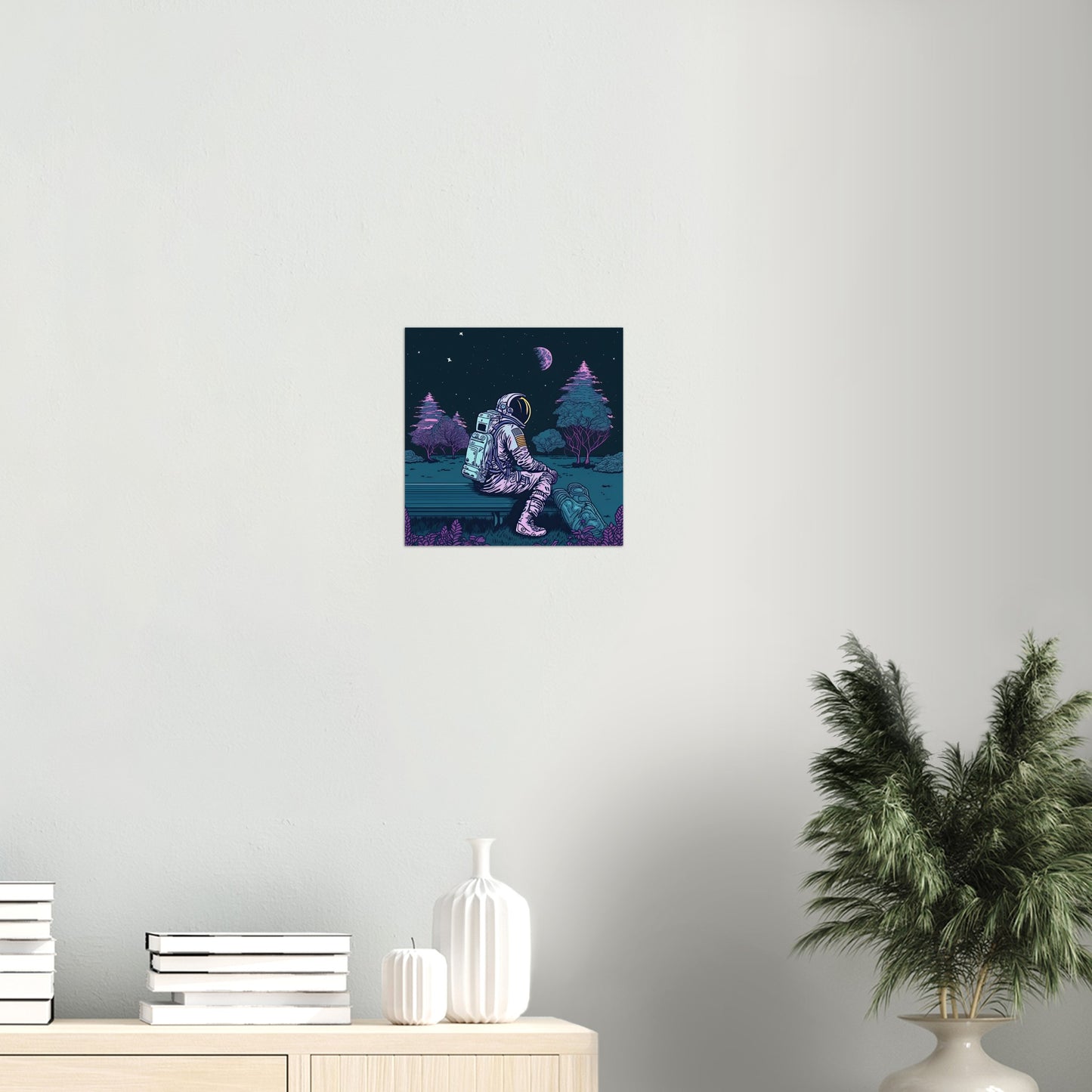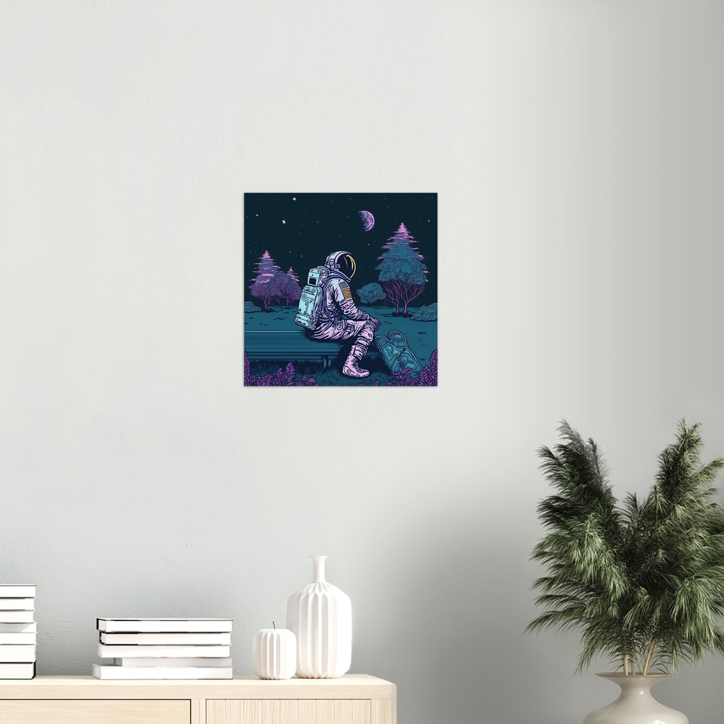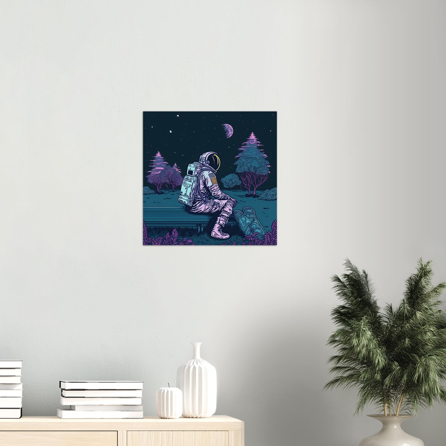 Wenn Du nachts in den Himmel blickst, stelle Dir folgende Frage: Schaust Du zu den Sternen, oder die Sterne zu Dir? Unser Astronaut sitzt auf einer Parkbank – wir wissen weder wo noch wann, und starrt in den Himmel. Die Parkbank lässt darauf schließen, dass es ein bewohnter Planet ist, aber selbst auf der Erde kann sich ein vernünftiger Mensch von Zeit zu Zeit wie ein Alien fühlen und in die ferne sehnen. Die Illustration ist ehr dunkel und überzeugt mit dezenten Farbkontrasten, um eine ruhige, nächtliche Stimmung zu erzeugen. Grün/Blau überwiegt auf diesem Wandbild, dass Sie wie immer als Poster mit und ohne Rahmen bei uns im Shop bestellen können. Der Astronaut ist Teil einer Reihe von Illustrationen, die Weltraumreisende in verschiedenen Situationen zeigen und kann perfekt mit anderen Bildern kombiniert werden. Schauen Sie auch unbedingt bei unseren bedruckten Tassen vorbei – da finden Sie alltägliches mit besonderer Kunst!