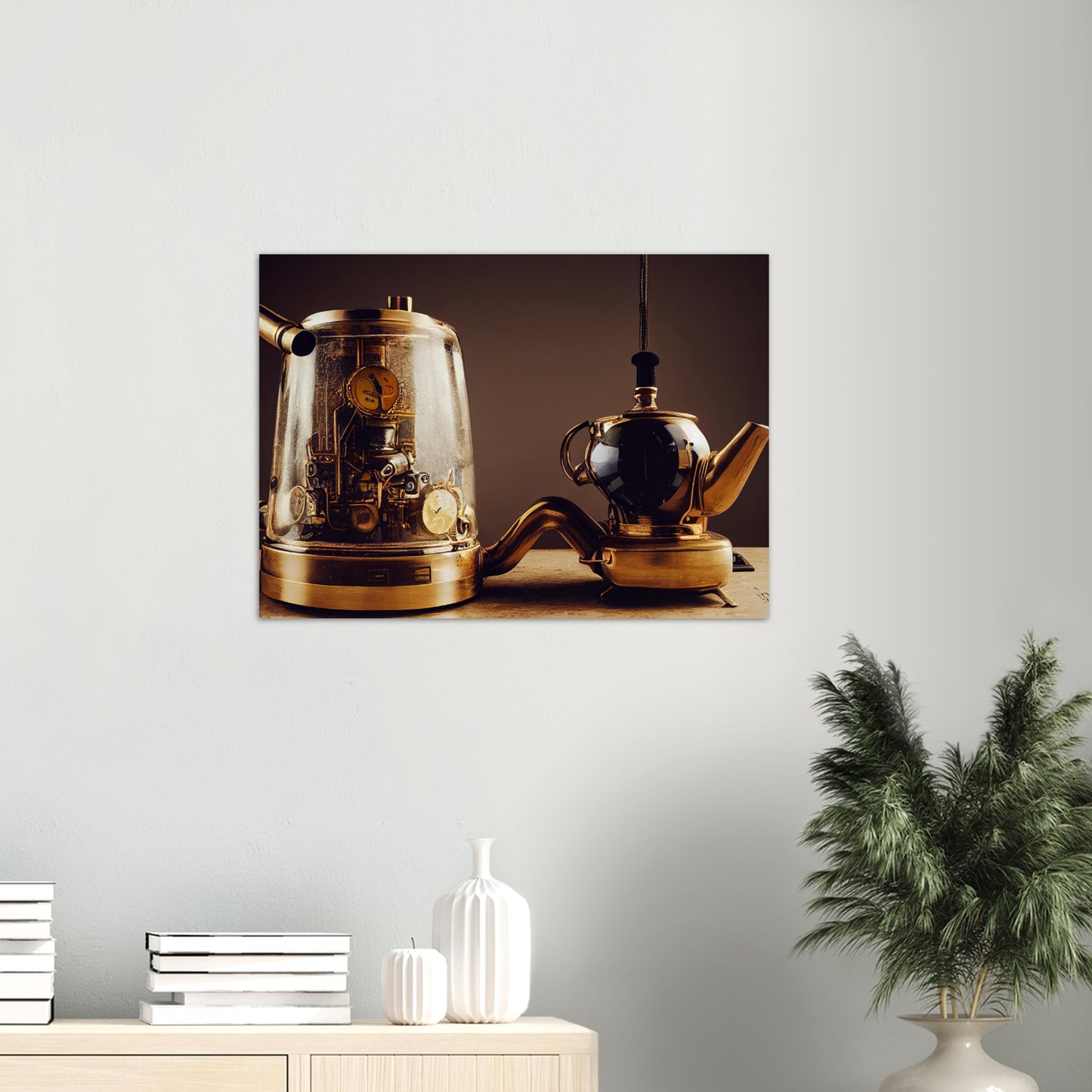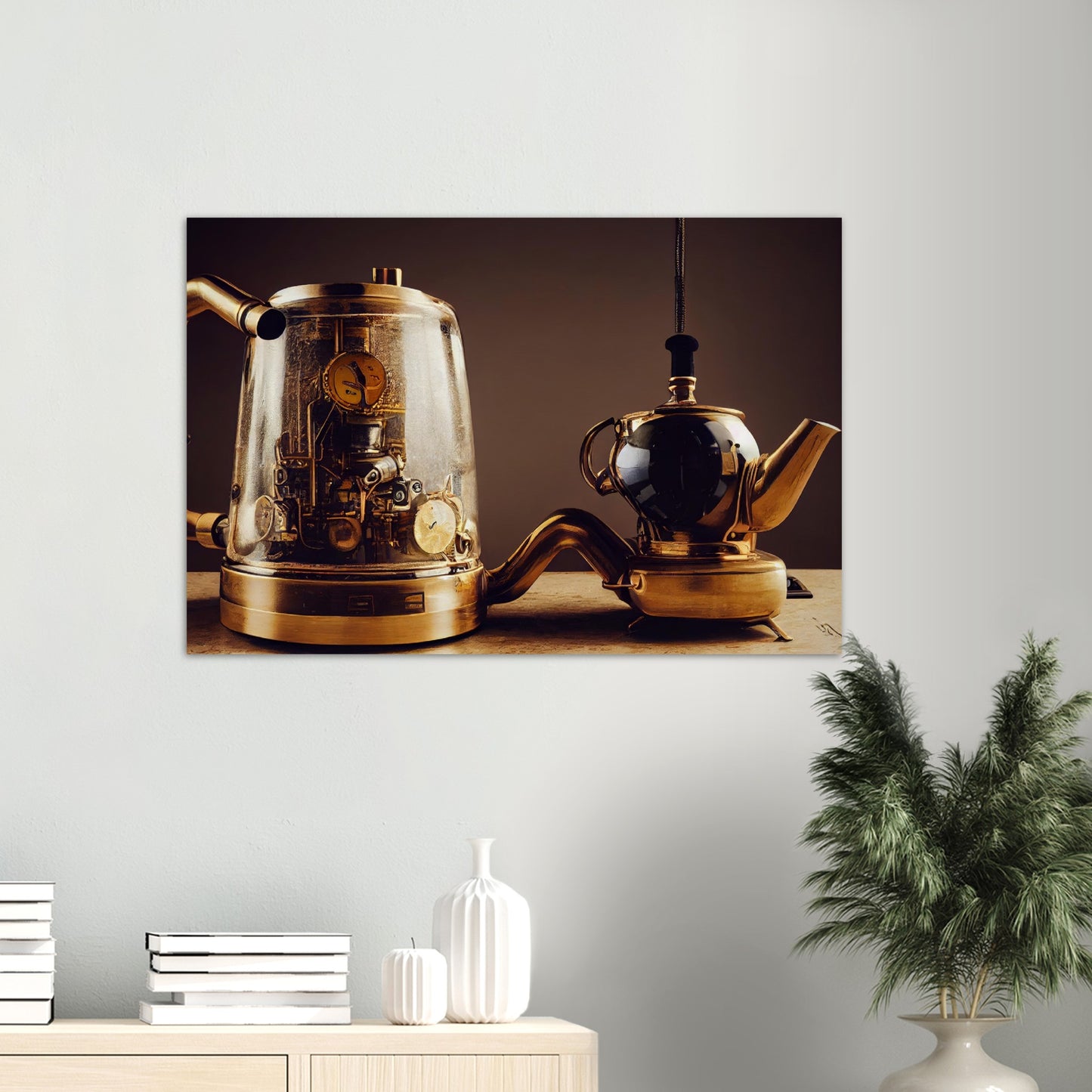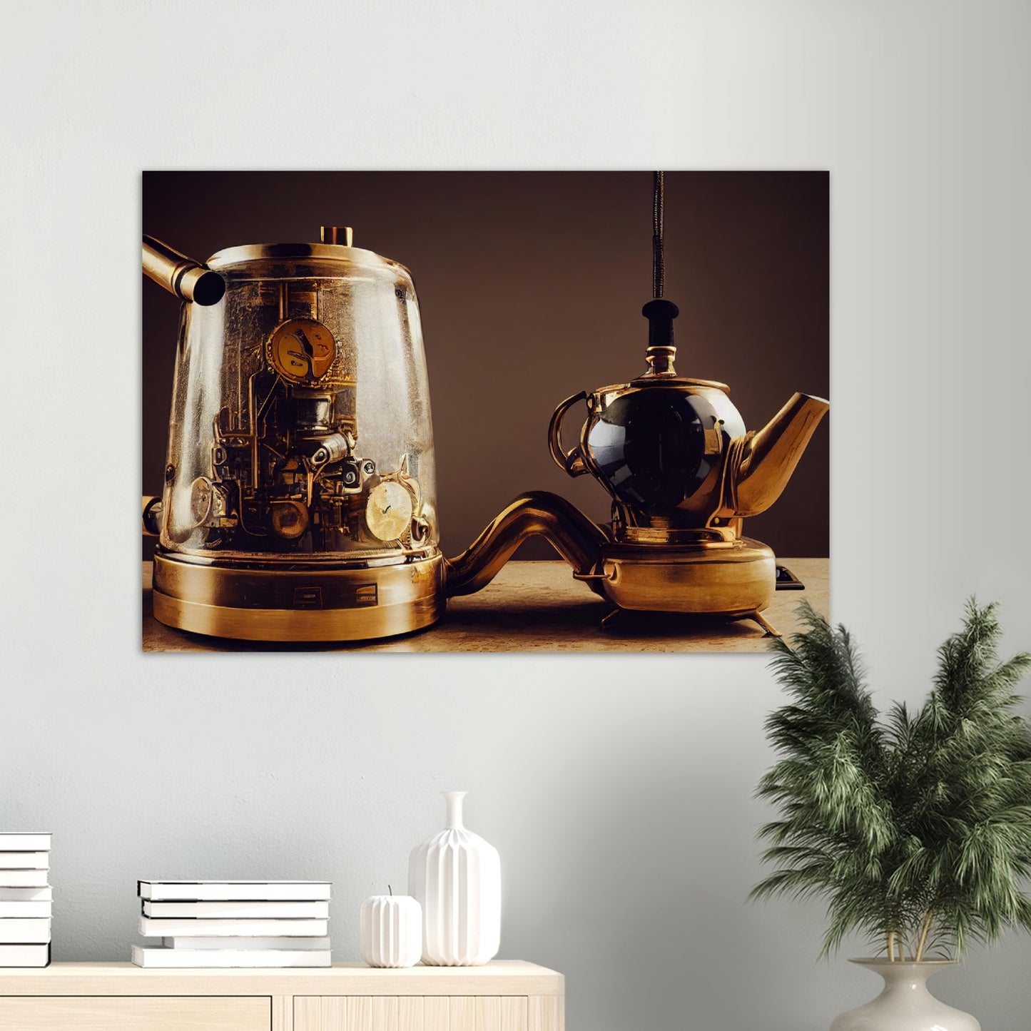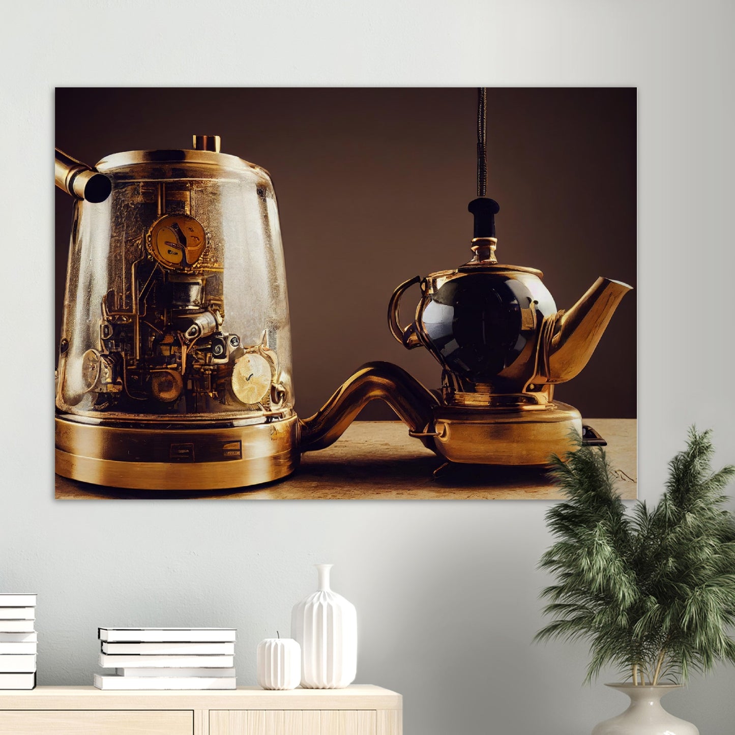 Pixelboys ist erfreut Ihnen eine Weltneuheit präsentieren zu können: Die Coffee-O-Matic 2022 Number 2! Diese Ensembles ist Wasserkocher, Samowar, Elektrisches Teekesselchen in einem! Gut, wir geben es zu – es ist nur ein Faksimile, aber es ist ei wunderschönes Stückwandkunst! Dieses Motiv zeigt eine weitere Steampunk Kaffeemaschine, dessen Handhabung sicherlich gewöhnungsbedürftig wäre – aber vor allem ist es ein Wandbild, dass einzigartig ist. Es eignet sich besonders gut im Professionellen Umfeld, wie einem Café, einer Bäckerei oder einem Restaurant, passt aber auch wunderbar in Küchen oder Esszimmer. Wenn Sie mit den vielen Details nicht zufrieden sind, schauen Sie sich auch gerne die anderen unserer 2022er Steampunk-Kaffeemaschinen an! Auch dieses exklusiv bei uns erhältliches Wandbild ist als Poster mit und ohne Leisten, gerahmt oder als Acrylbild erhältlich. Selbstverständlich gibt es dieses auch als bedruckte Tasse – für den kleinen Kaffeegenuss zwischendurch!