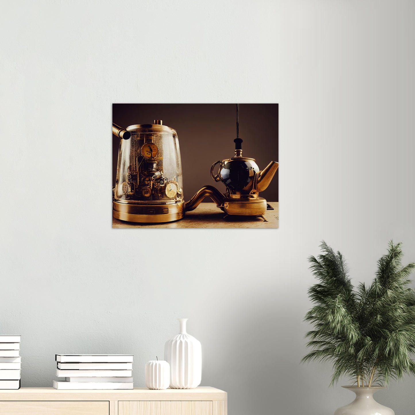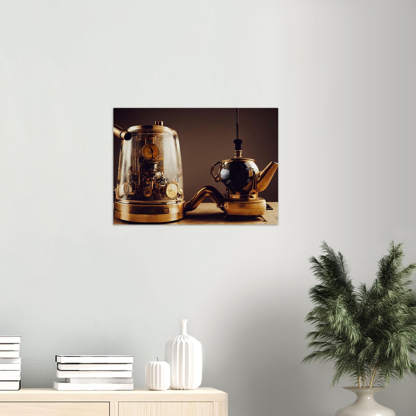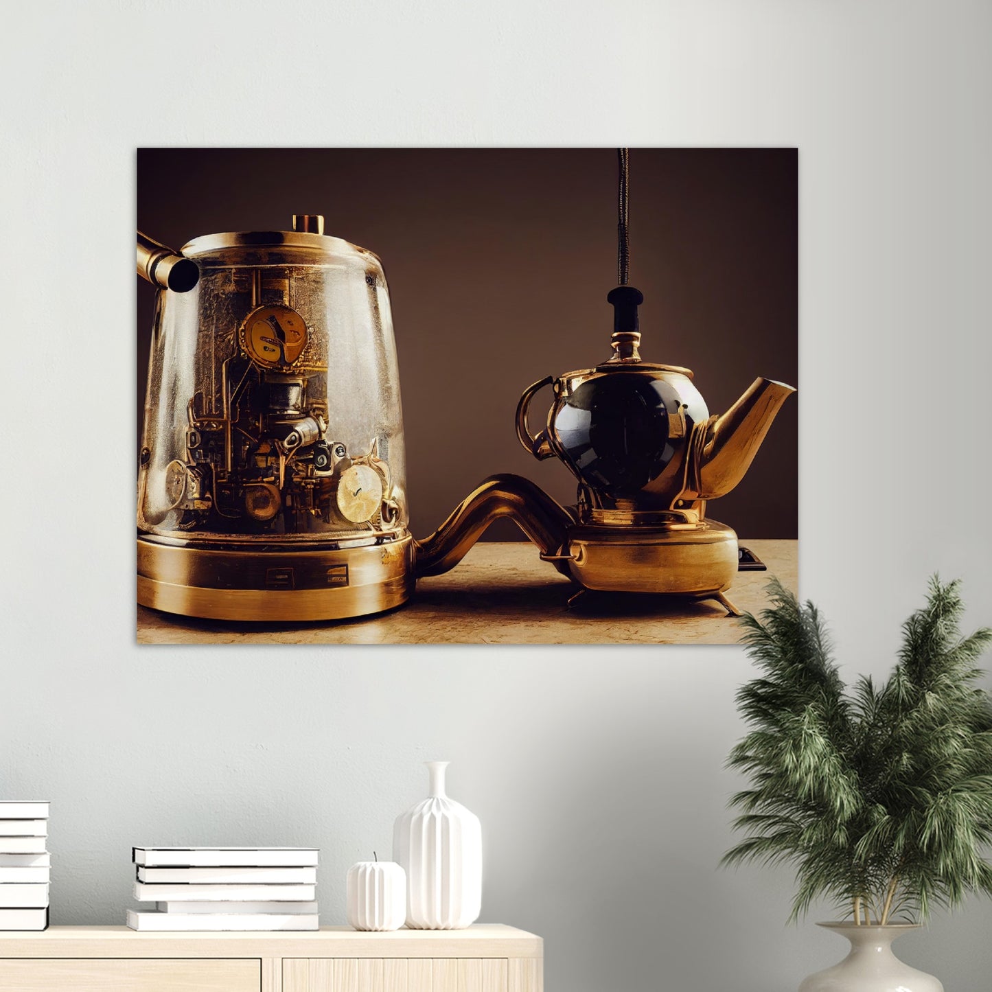 Pixelboys ist erfreut Ihnen eine Weltneuheit präsentieren zu können: Die Coffee-O-Matic 2022 Number 2! Diese Ensembles ist Wasserkocher, Samowar, Elektrisches Teekesselchen in einem! Gut, wir geben es zu – es ist nur ein Faksimile, aber es ist ei wunderschönes Stückwandkunst! Dieses Motiv zeigt eine weitere Steampunk Kaffeemaschine, dessen Handhabung sicherlich gewöhnungsbedürftig wäre – aber vor allem ist es ein Wandbild, dass einzigartig ist. Es eignet sich besonders gut im Professionellen Umfeld, wie einem Café, einer Bäckerei oder einem Restaurant, passt aber auch wunderbar in Küchen oder Esszimmer. Wenn Sie mit den vielen Details nicht zufrieden sind, schauen Sie sich auch gerne die anderen unserer 2022er Steampunk-Kaffeemaschinen an! Auch dieses exklusiv bei uns erhältliches Wandbild ist als Poster mit und ohne Leisten, gerahmt oder als Acrylbild erhältlich. Selbstverständlich gibt es dieses auch als bedruckte Tasse – für den kleinen Kaffeegenuss zwischendurch!