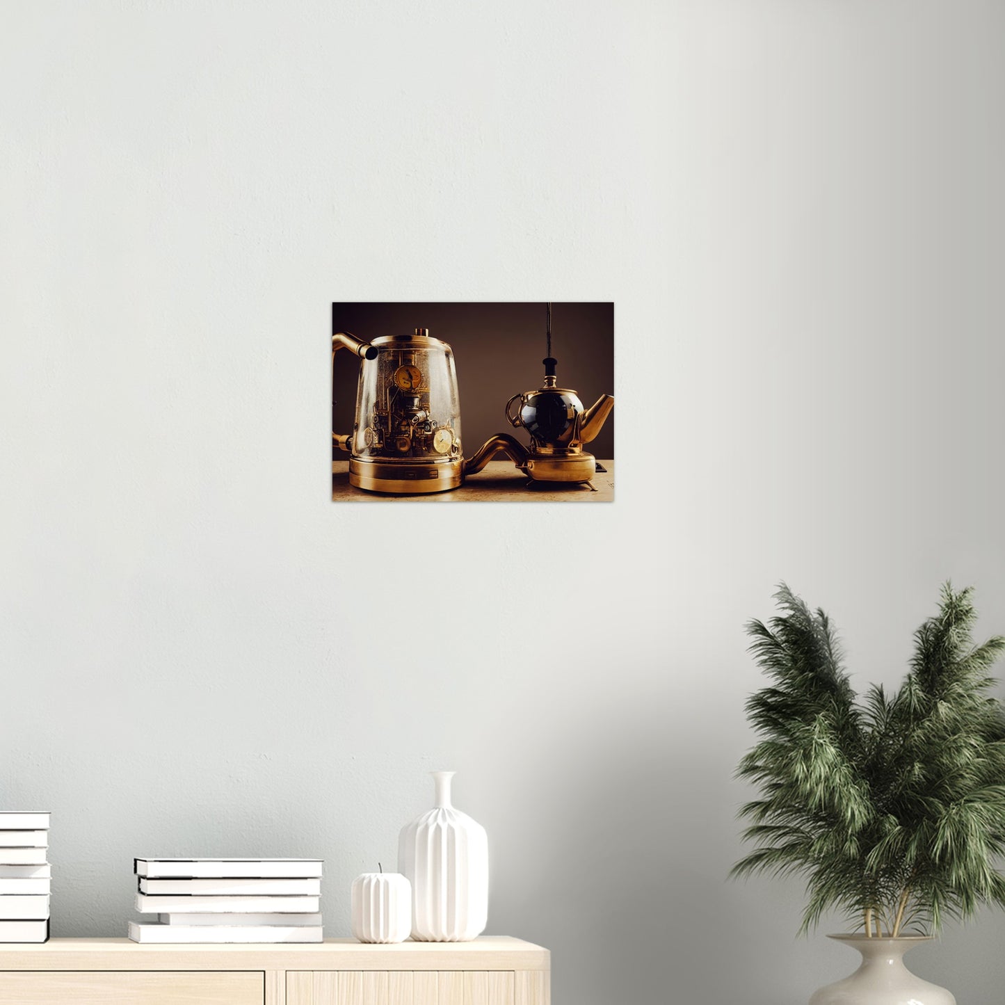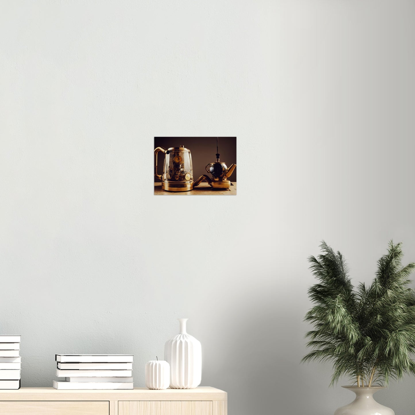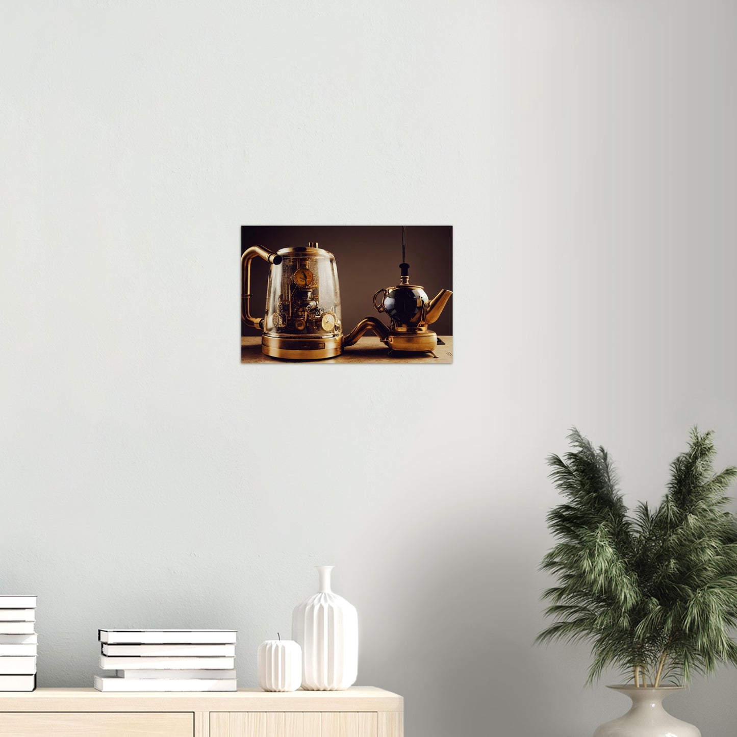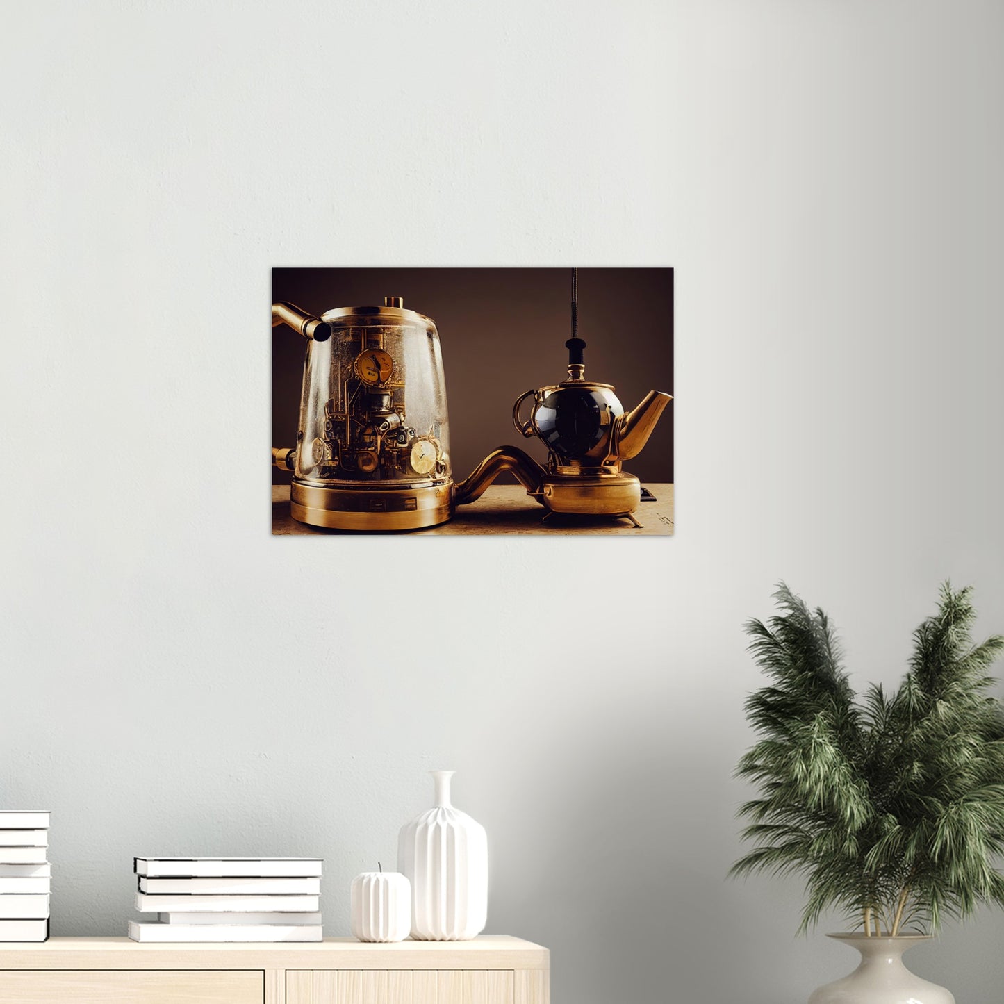 Pixelboys ist erfreut Ihnen eine Weltneuheit präsentieren zu können: Die Coffee-O-Matic 2022 Number 2! Diese Ensembles ist Wasserkocher, Samowar, Elektrisches Teekesselchen in einem! Gut, wir geben es zu – es ist nur ein Faksimile, aber es ist ei wunderschönes Stückwandkunst! Dieses Motiv zeigt eine weitere Steampunk Kaffeemaschine, dessen Handhabung sicherlich gewöhnungsbedürftig wäre – aber vor allem ist es ein Wandbild, dass einzigartig ist. Es eignet sich besonders gut im Professionellen Umfeld, wie einem Café, einer Bäckerei oder einem Restaurant, passt aber auch wunderbar in Küchen oder Esszimmer. Wenn Sie mit den vielen Details nicht zufrieden sind, schauen Sie sich auch gerne die anderen unserer 2022er Steampunk-Kaffeemaschinen an! Auch dieses exklusiv bei uns erhältliches Wandbild ist als Poster mit und ohne Leisten, gerahmt oder als Acrylbild erhältlich. Selbstverständlich gibt es dieses auch als bedruckte Tasse – für den kleinen Kaffeegenuss zwischendurch!